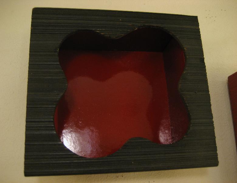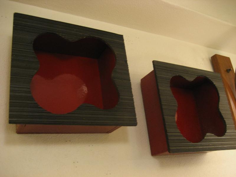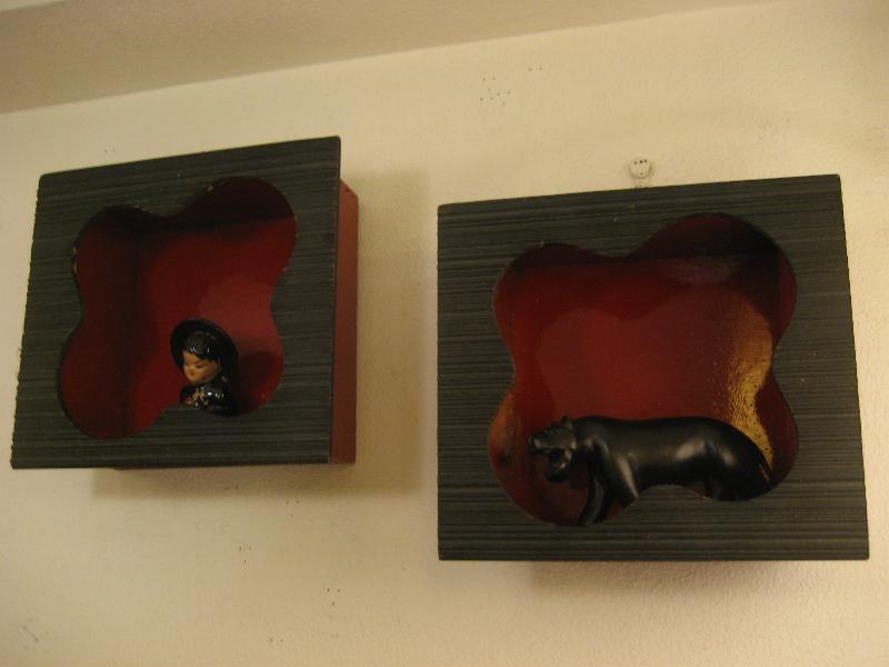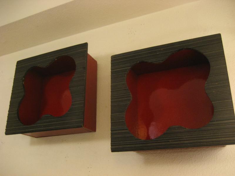 | ビンテージペアウォールシェルフ / 50年代 USA フロントフレームがアトミックなアメーバブーメランシェイプのペアシャドウボックスシェルフ。黒赤のカラーマッチが独特のアクセント。置物などの飾りにおススメです! クールでGOODなビンテージウォールディスプレイピース! |
