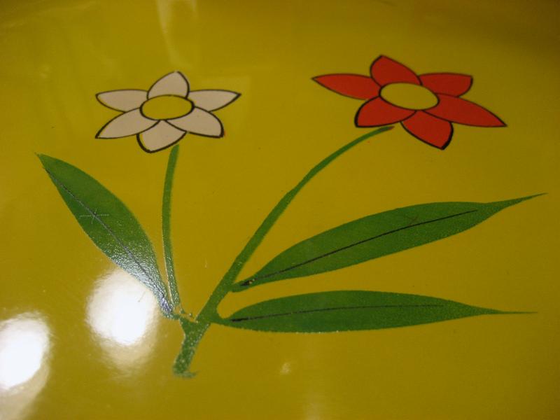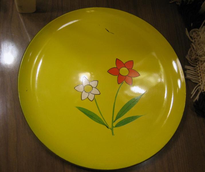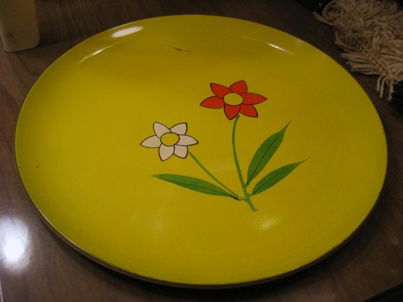Stainproof Lacquer Ware. Made in Japan. ラッカーウェア(エナメル塗装された)のラウンドシェイプ花柄トレー。イエローベースにオレンジとホワイトの花が描かれています。キュートでGOODなビンテージコレクティブルピース! |