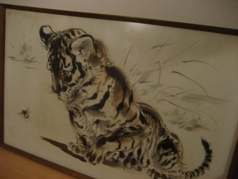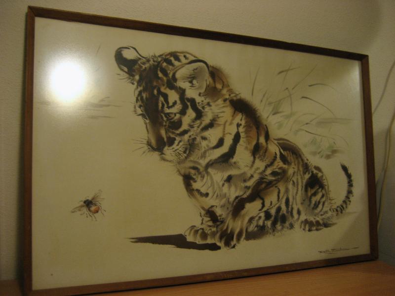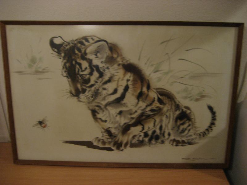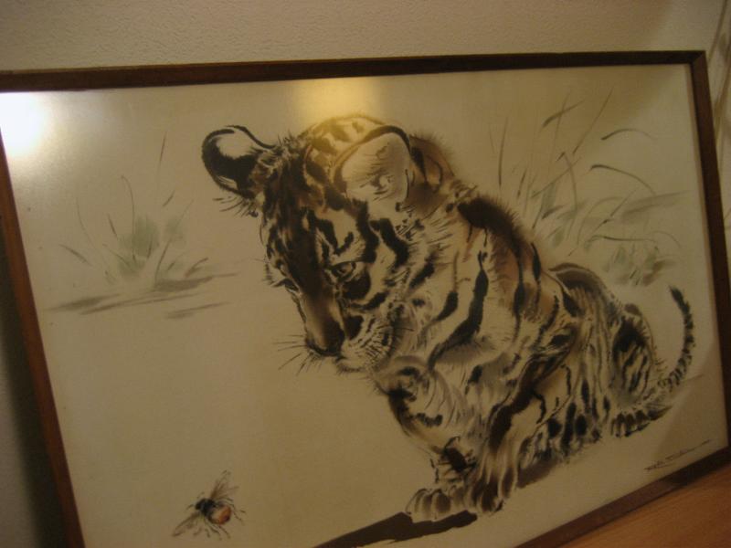 | ビンテージウォールアートフレーム / 70年代 USA "RALPH THOMPSON" ウッドパネルに転写されたアニマルアートフレームのビンテージウォールデコ。フレームはウッドメイド。フロント右下にアーティストサインがあるのと、裏面には作品ステッカーが貼ってあります。 "RALPH THOMPSON / Tiger Cub and Bumble Bee" ← 直訳すると 「トラの子とマルハナバチ」 タイトルから、 「トラの子供がハチと戯れている感じ」 を描いています。とても繊細な描写で子供向けの動物絵本のイラストなども描いていたようで翻訳版が日本で出ていたようです。 クールでキュート、そしてGOODなビンテージウォールデコレーションピース! ■Ralph Thompson (1913-2009)■ アーティストでありイラストレーター。主に動物を描いた作品が多く、子供向けの絵本などのイラストも数多く手がけている。 |