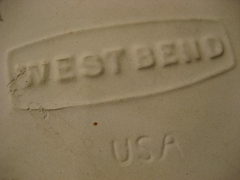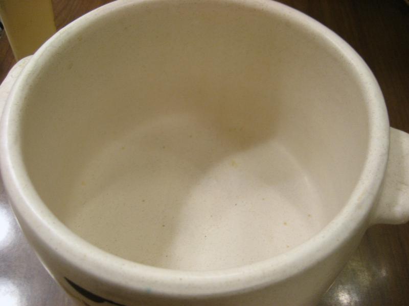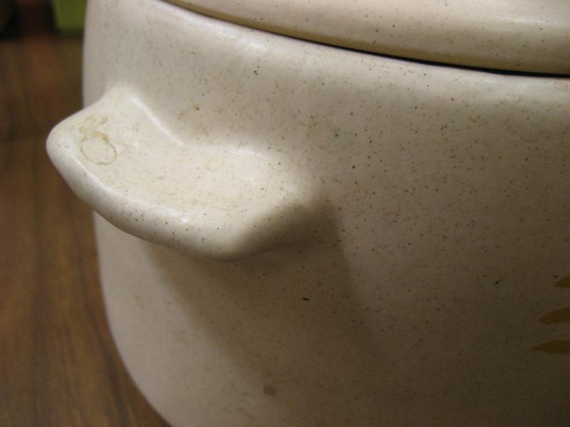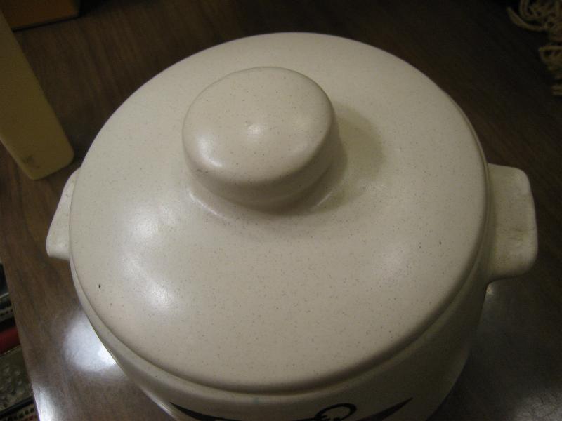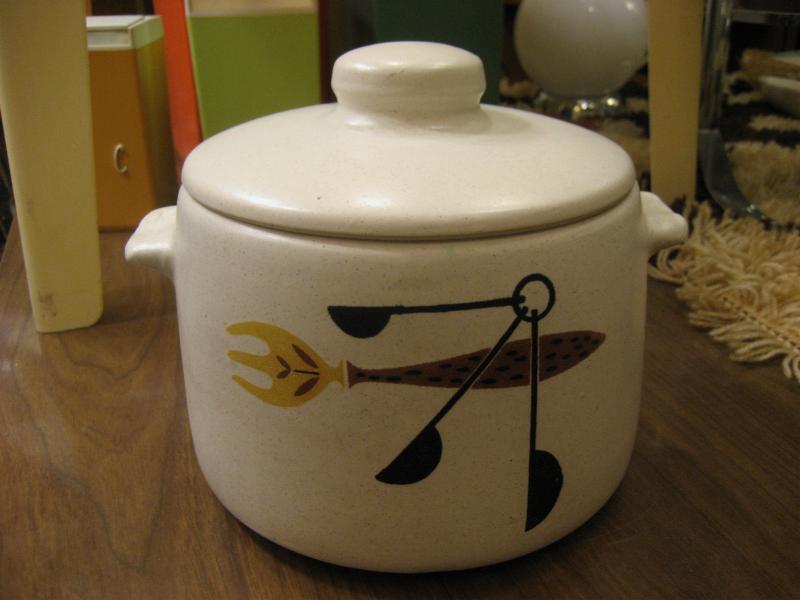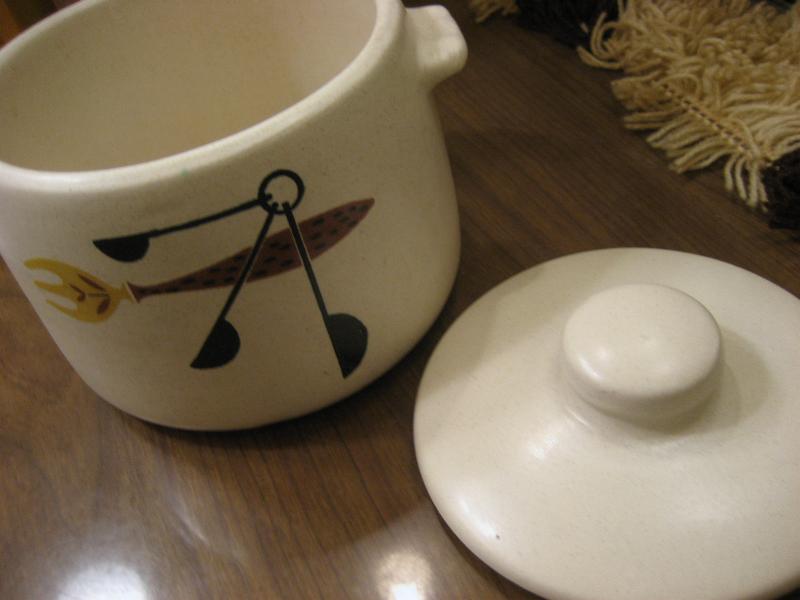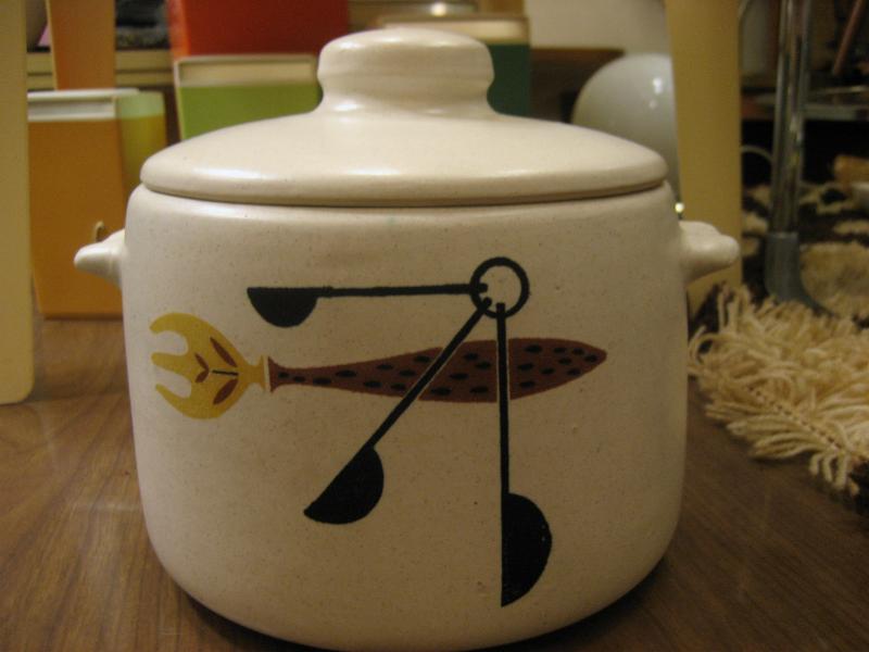 | ビンテージキッチンテーブルウェア / 60年代 WESTBEND, USA 陶器製のカバー付きキッチンポット。アメリカでは "Bean Pot (豆の鉢)" や "Stoneware (石器)" などと紹介されているようですが、まぁ何に使っても自由ですね! 側面にキッチン用具の絵柄が描かれています。 クールでGOODなビンテージキッチンテーブルピース! |