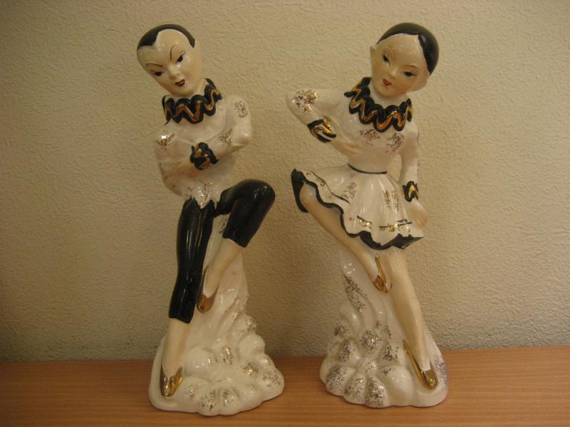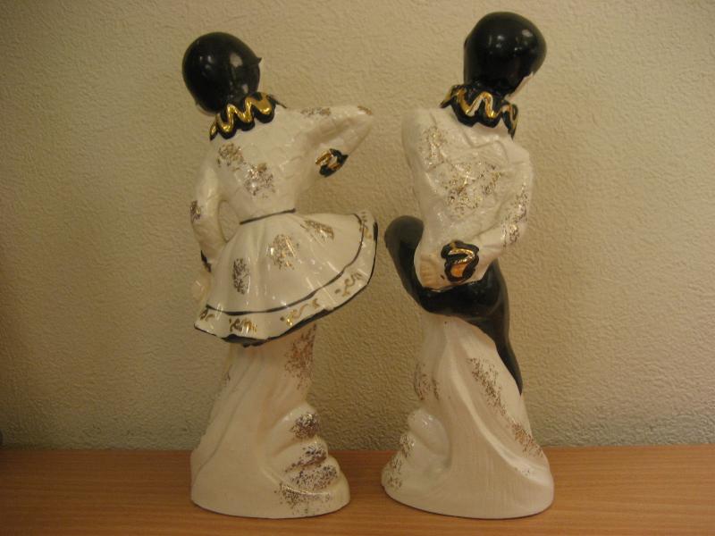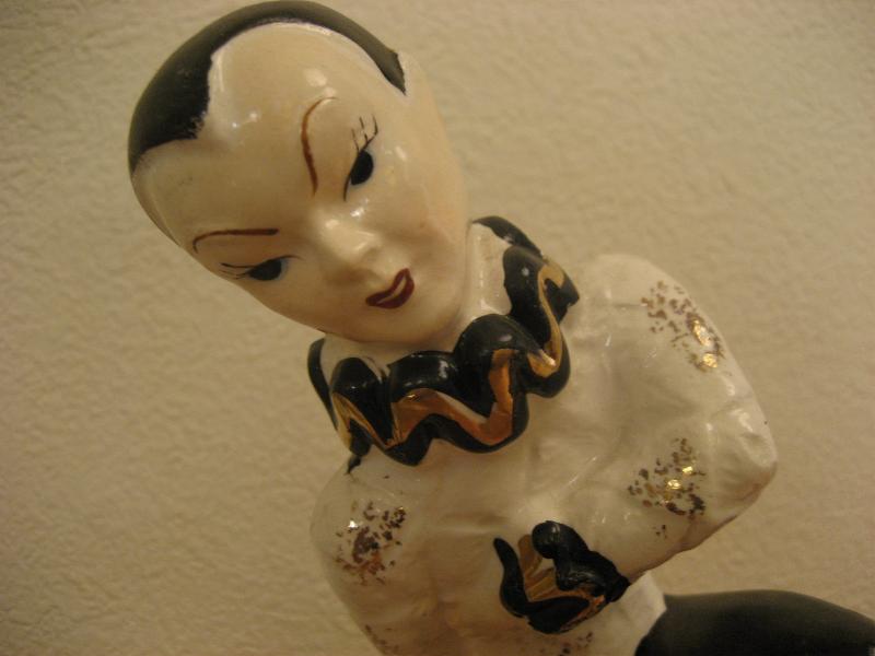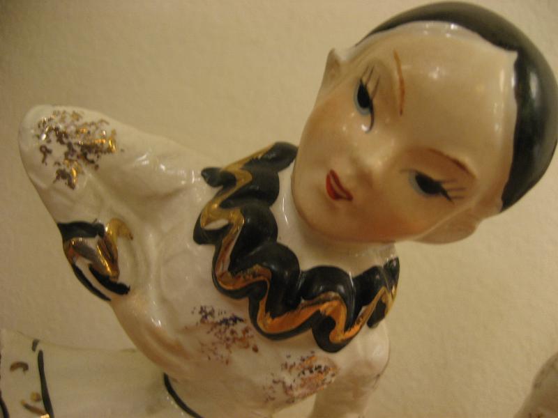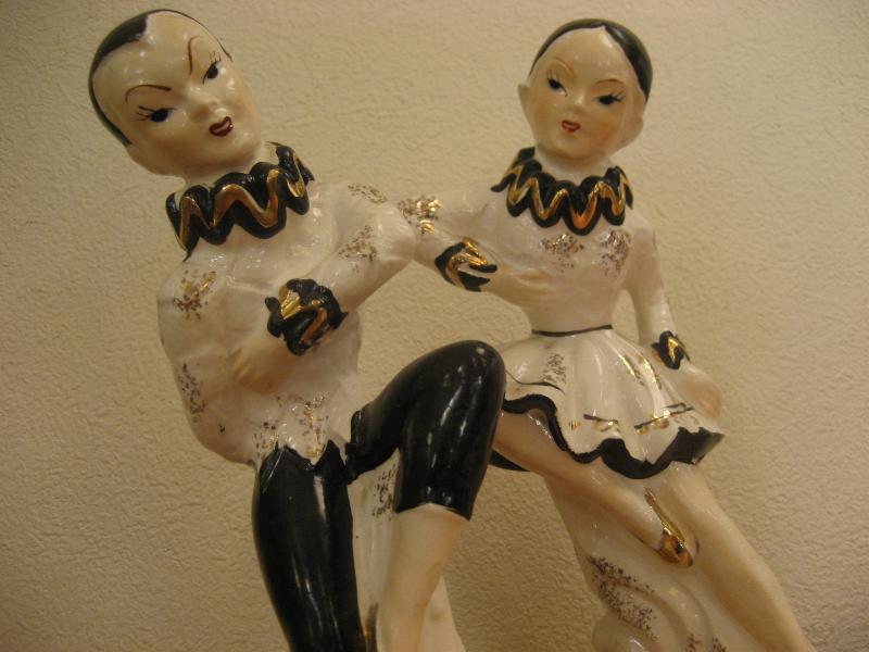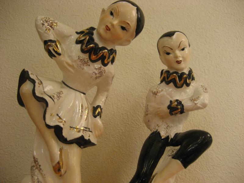 | ペアビンテージハーレクインデコ / 50年代 USA. JAPAN MADE 50'sど真ん中って感じの陶器製ハーレクインダンサー置物セット。カラーはこの時代の定番でもあるホワイト・ブラック・ゴールドでディティールもハーレクインダンサーコスチュームスタイルにゴールドアクセント。クールでGOODなビンテージデコレーションピース! |