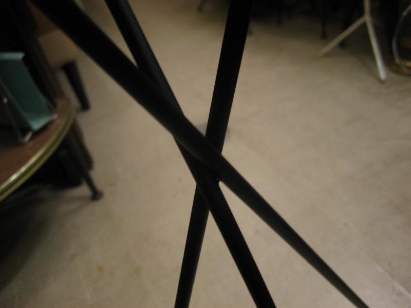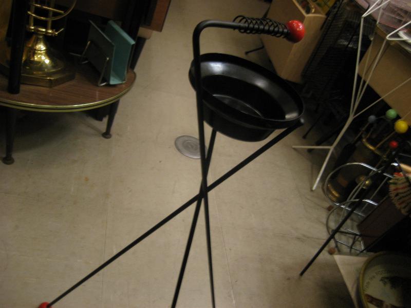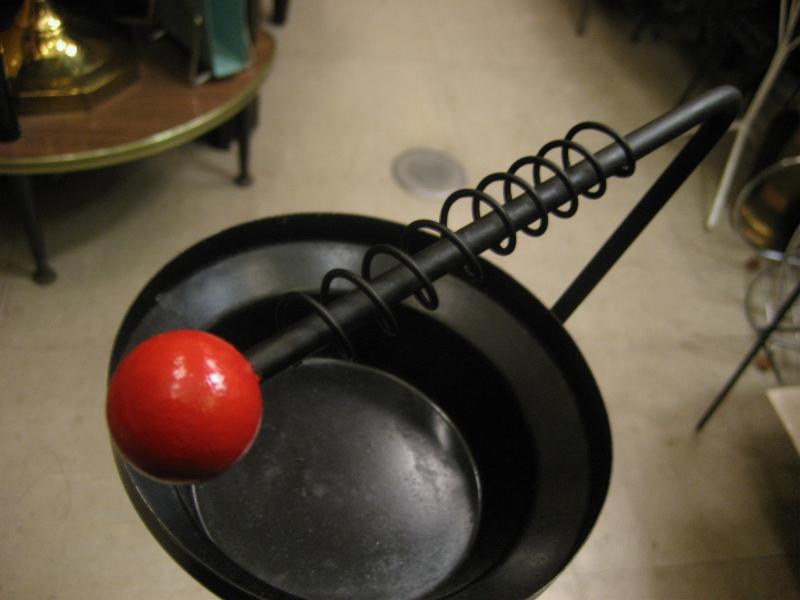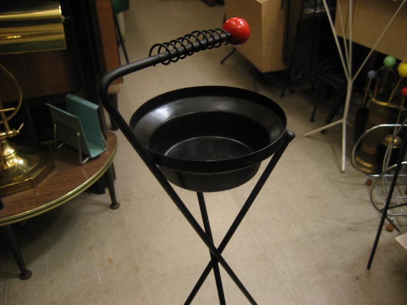| ビンテージアッシュトレイスタンド / 50年代 USA. ブラックアイアンフレームにスチールトレイのワイヤー灰皿スタンド。トップアームにスプリングコイルが付いていてタバコ置きになっていて、トップアーム先端と3本レッグ先にレッドカラーペイントされたウッドボールアクセント。ソファやチェアサイド、ベランダなどにクールでGOODなビンテージフロアピース! |