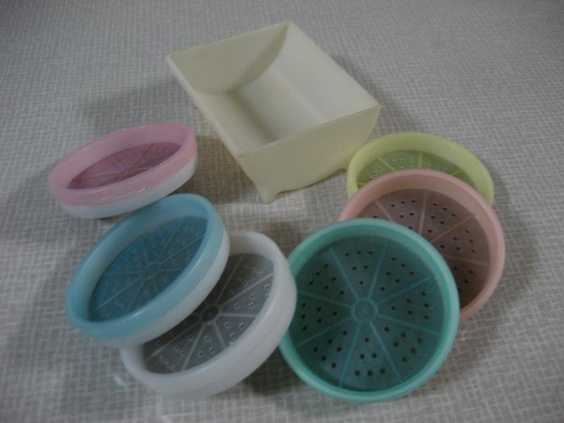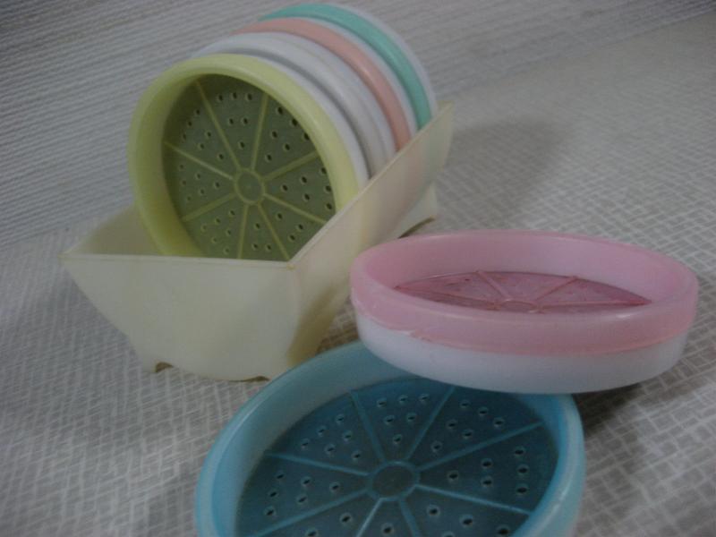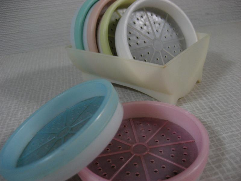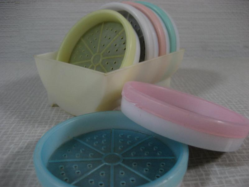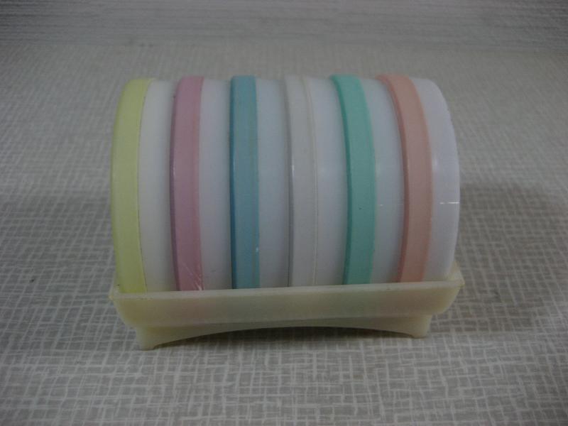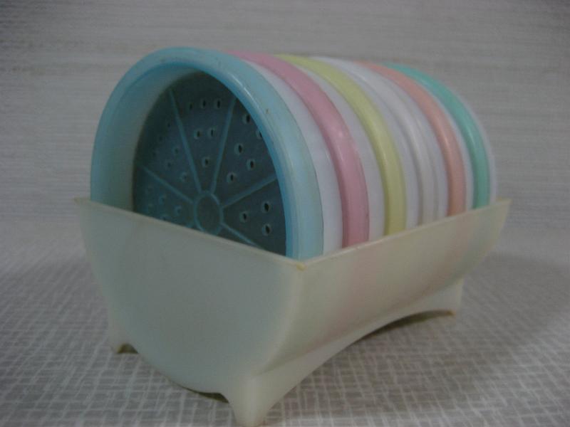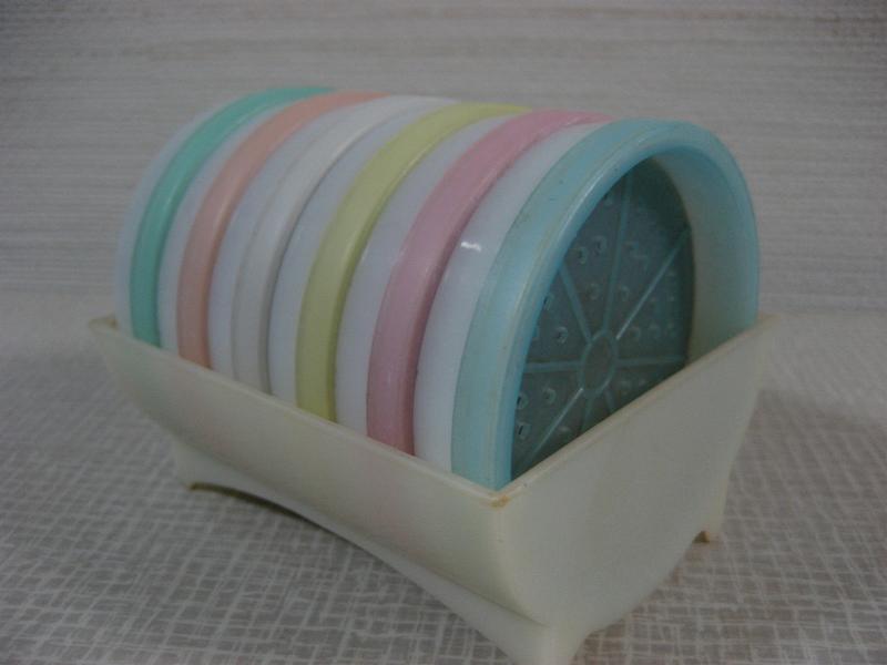 | ビンテージドリンクコースターセット / 60年代 TUPPERWARE, MADE IN USA オールド"TUPPERWARE"のプラスチックメイドコースターセット。デコレーションにも良いですよ。。。コースター6枚入りでホルダーにセットされています。ドリンクタイムが楽しくなるクールでGOODなビンテージテーブルウェア! |