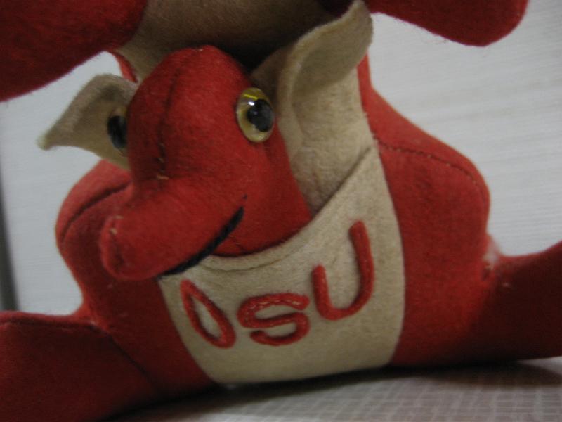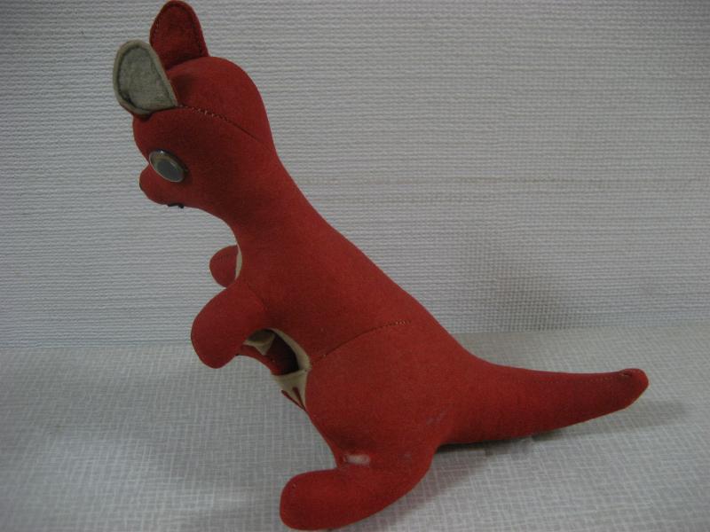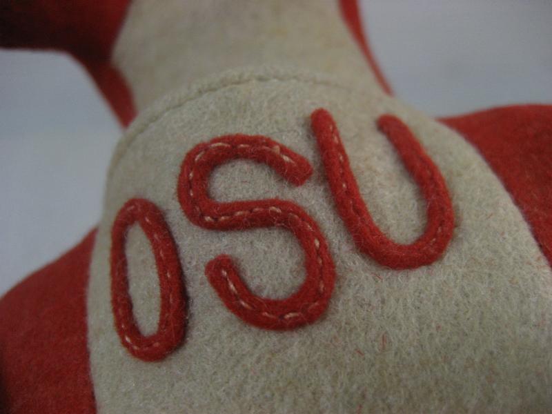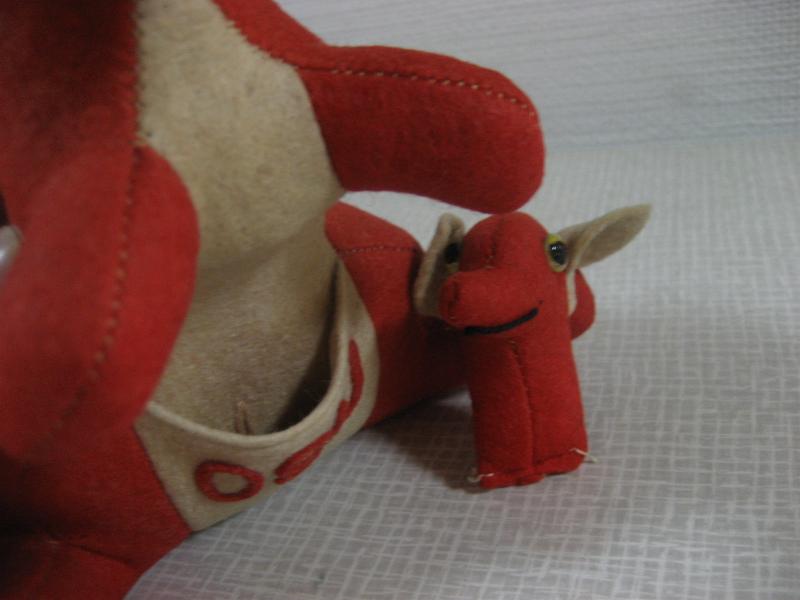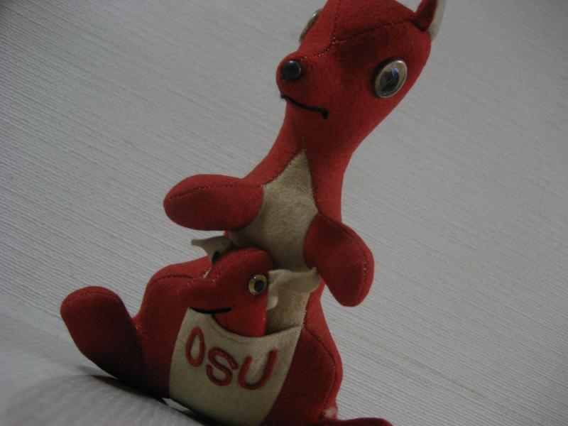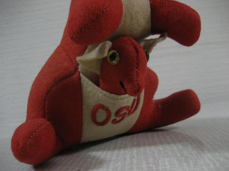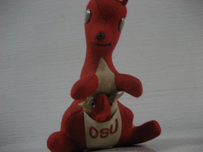 | ビンテージカレッジマスコットドール / 40−50年代 Collegiate Mfg. USA 当時、アメリカの大学やハイスクール、クラブチームなどのマスコットキャラクターとして作られていたぬいぐるみ。カレッジイニシャルはフェルトパッチで OSU 。"Oregon State University"、"Ohio State University"、"Oklahoma State University"などの略で大学マスコット。ウールフェルトメイドのカンガルー。おなかの袋に子供も入っていて取り外し可。 上記写真Collegiate Mfgのカタログにも掲載されているタイプの色違い。レアです! ※但し、メーカータグはロストしています。