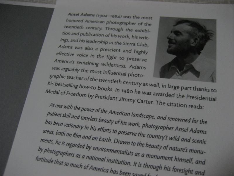 | アンセル・アダムス(Ansel Adams 1902 - 1984) アメリカの写真家。カリフォルニア州ヨセミテ渓谷のモノクロ写真で有名。写真に関する数々の著作でも知られている。 特に写真技術を扱った本(The Camera, The Negative and The Print)が有名。 |