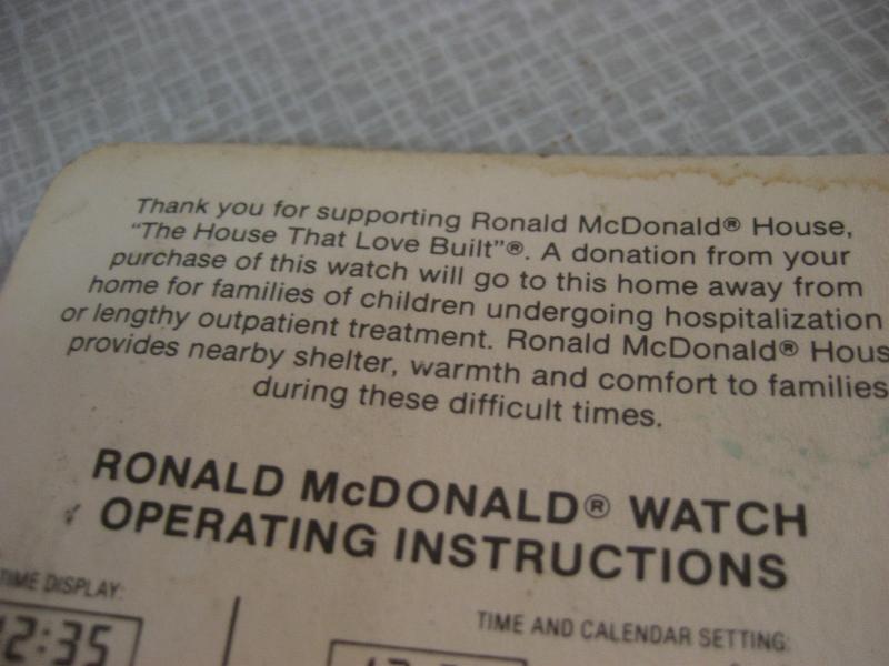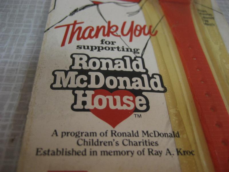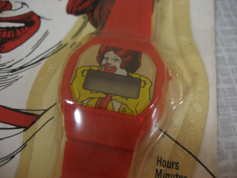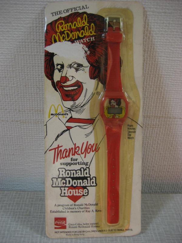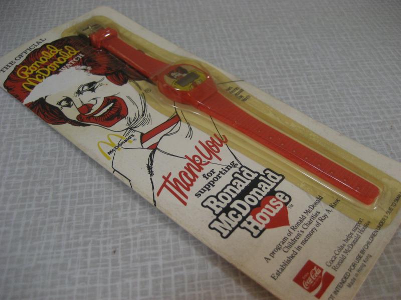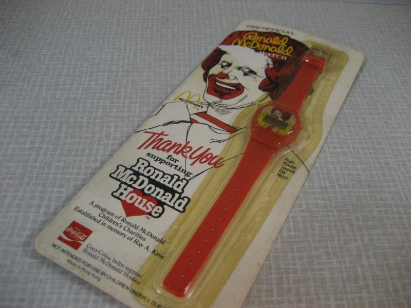 | ビンテージマクドナルドノベルティウォッチ / 80年代 USA デッドストック(未開封) ©1984 McDonal's Corporation Made in Hong Kong アメリカのハンバーガーチェーン、マクドナルドのノベルティウォッチ。1984年、創業者 "Ray A. Kroc" の追悼メモリーで作られたもののひとつと思われます。マクドナルドの子供慈善団体を通して配られたものでしょうか。。。パッケージ保存のため、未開封ですので動作は未確認です。ご了承いただきディスプレイとしてお楽しみください。キュートでGOODなビンテージコレクティブルピース! |