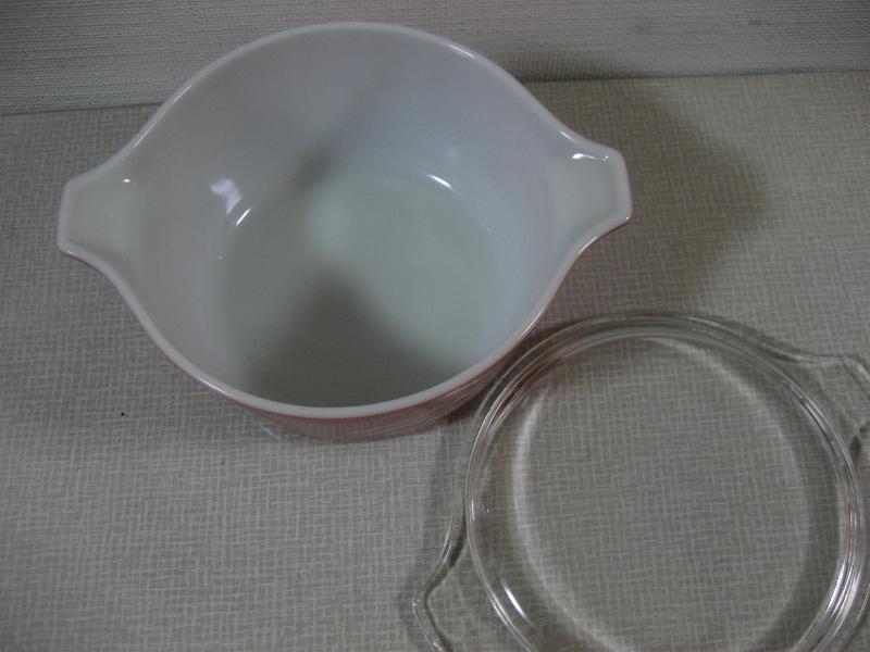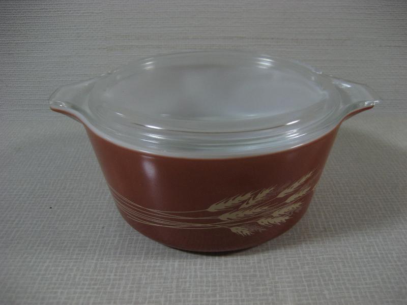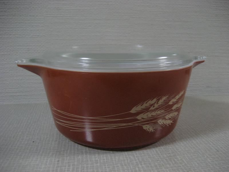 | ビンテージパイレックスキャセロール / 60年代 USA クリアカバー付きの耐熱ガラスメイドのオールドパイレックスキャセロール。サイドの絵柄はウィート(麦)。 |