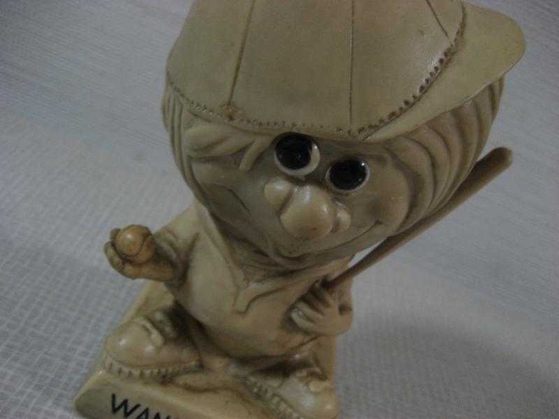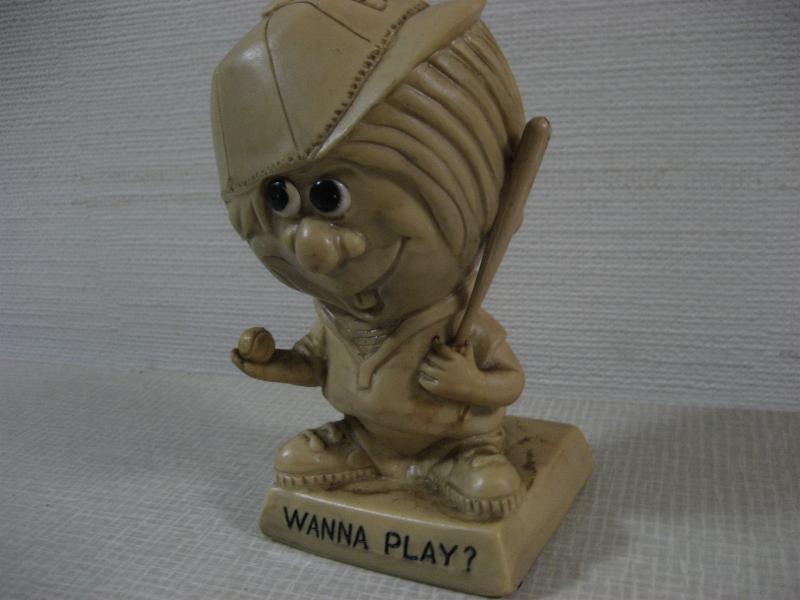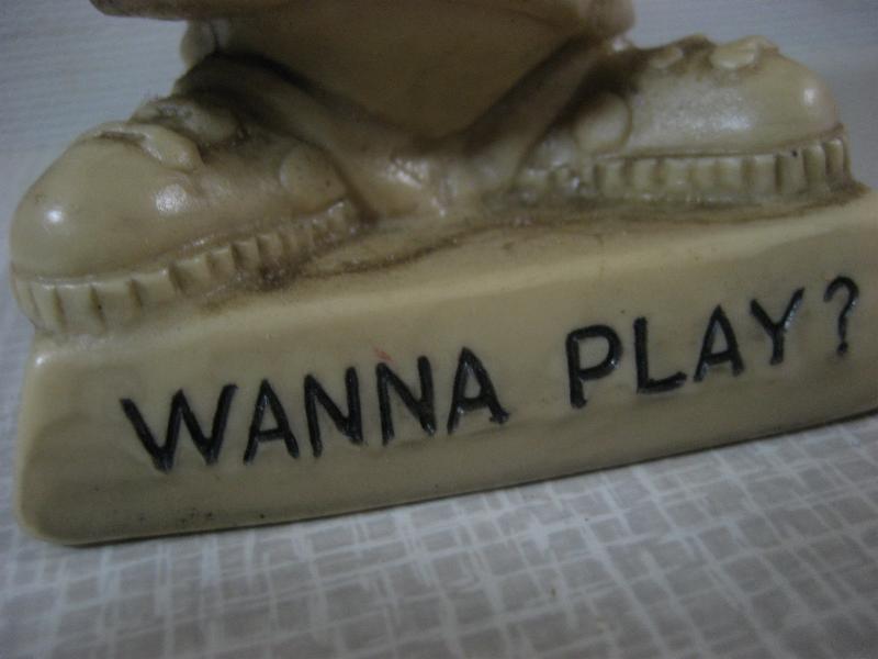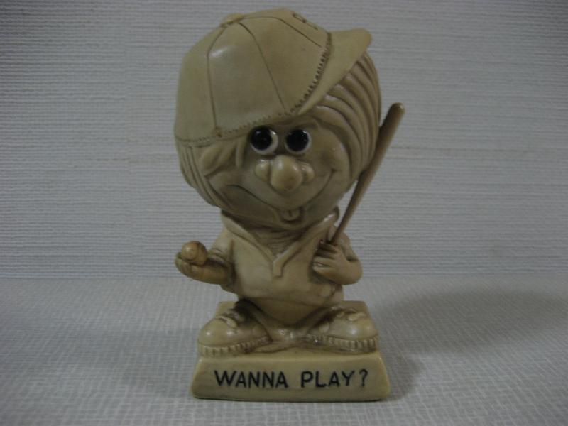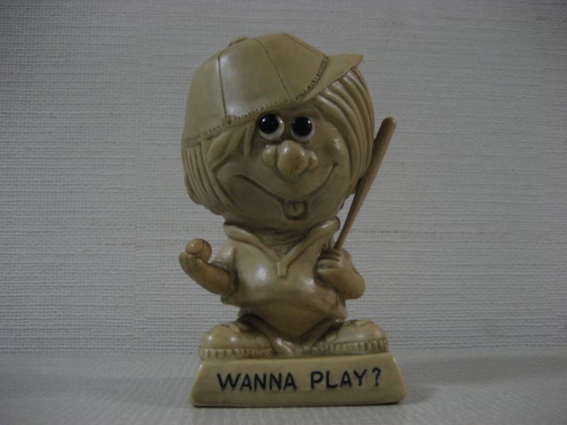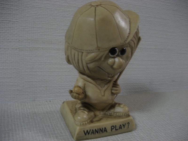 Berrie 1970. MADE IN USA. "WANNA PLAY ? " → "遊ばない?" という感じのメッセージが書かれた樹脂製の置物。こちらは野球のユニフォームを着た少年で、70年代に流行したメッセージドール。当時いろいろなタイプがあったようです。RUSS BERRIE社が販売を始めたのが68年頃と言われているので比較的初期の方のメッセージドールになります。キュートでGOODなビンテージコレクティブルピース! |