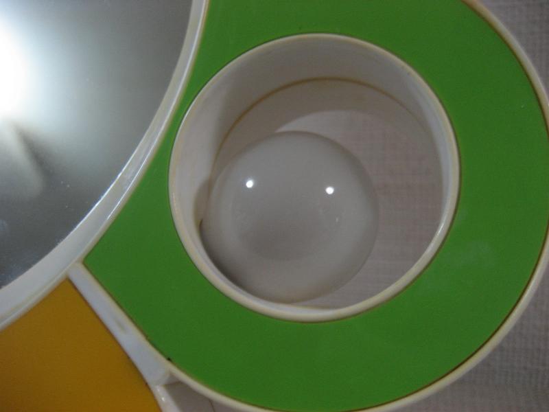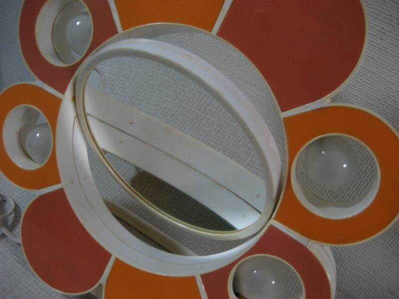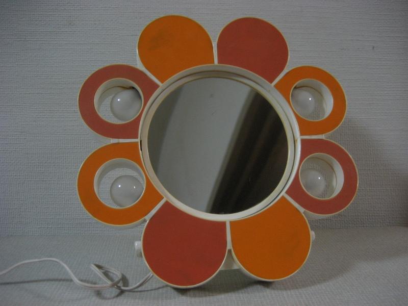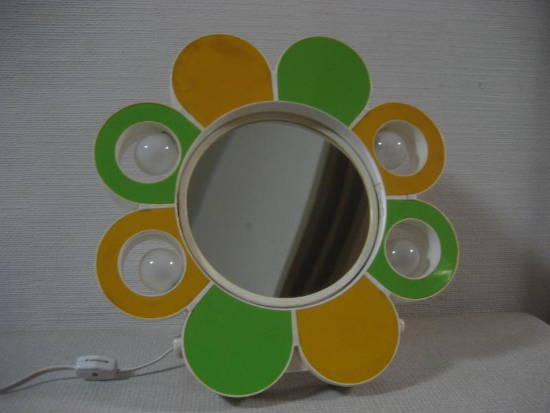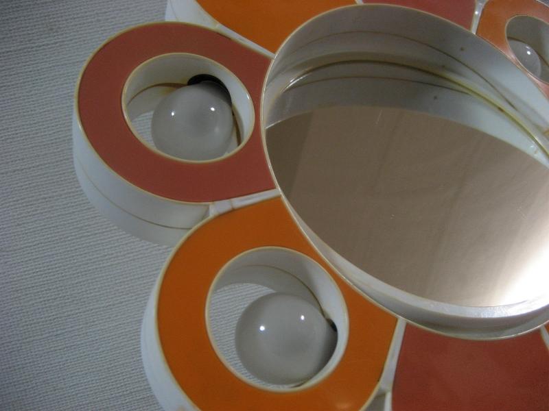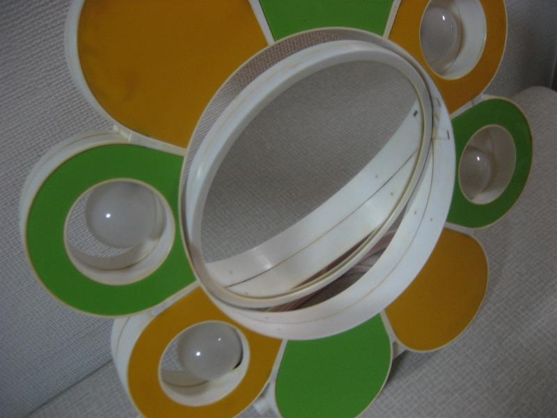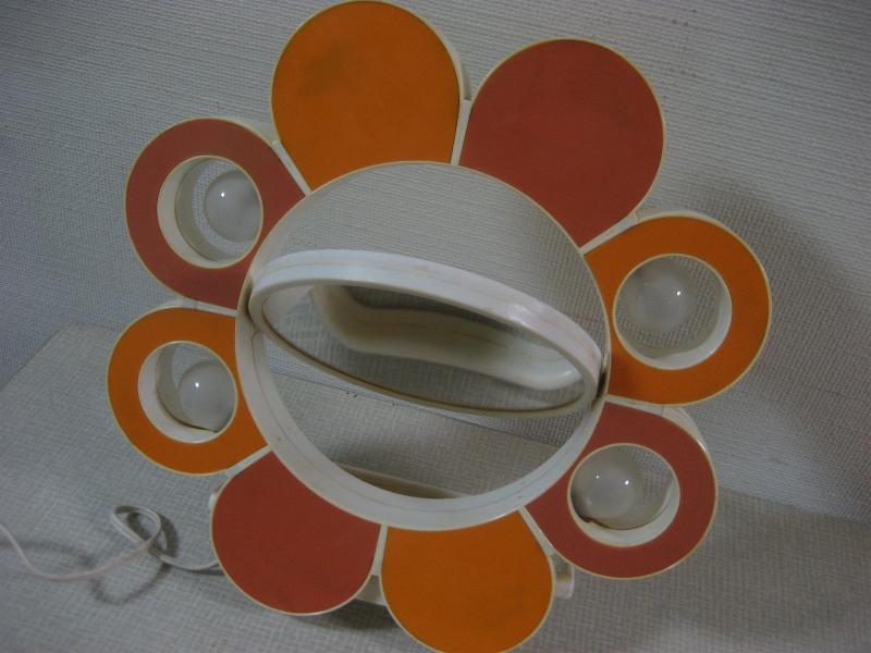 | ビンテージアトミックライトアップメイクアップミラー / 60年代 USA 2色のカラーが楽しめるフラワーシェイプのメイクアップ用ポータブルランプミラー。サイドの花びら部分にランプが4個付いていて点灯します。鏡はフラットフェイスと凹面鏡(クローズアップ用)の2種類で回転可能。クールでGOODなビンテージバニティピース!電源は家庭用対応コードでスイッチはコード中間に付いています。電源コードは本体下部分に収納OK。 |