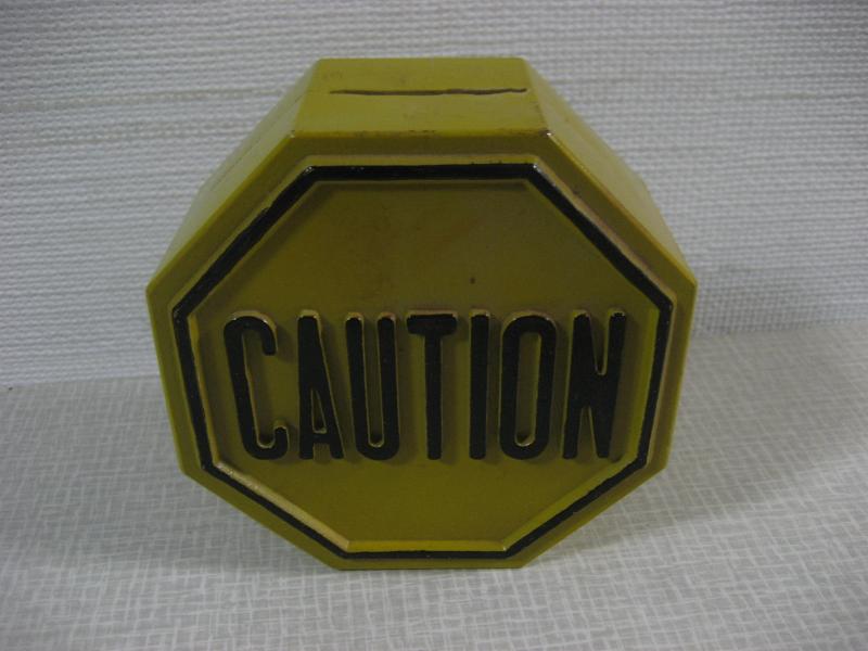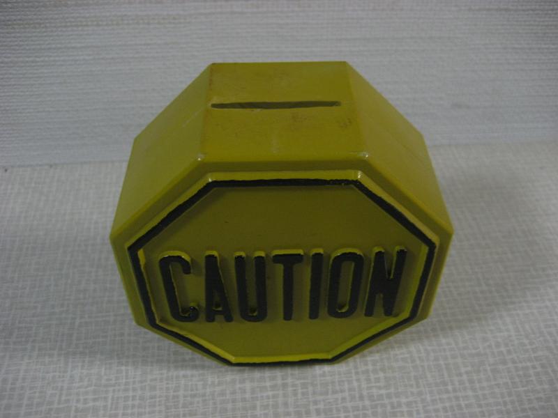 | ビンテージレトロバンク / 70年代 USA アメリカの道路標識デザイン貯金箱。工事中の道路などに立っている"CAUTION"(注意)の看板。両面同じデザイン絵柄で八角形立体。クールでGOODなビンテージコレクティブルピース! |