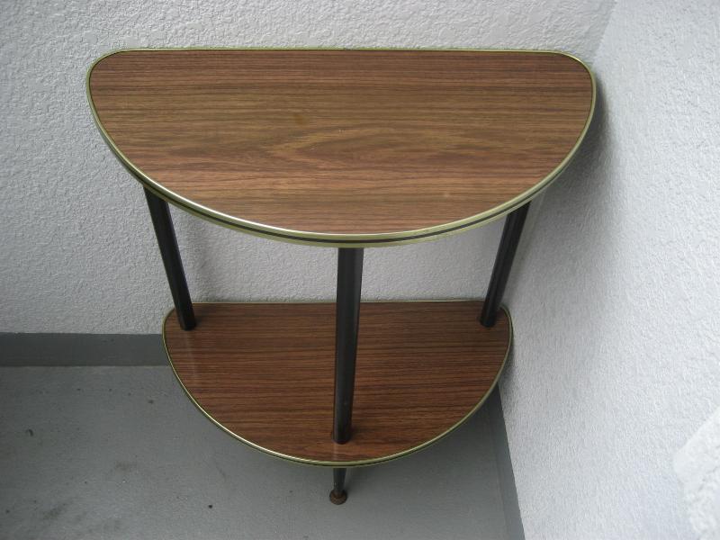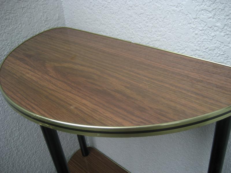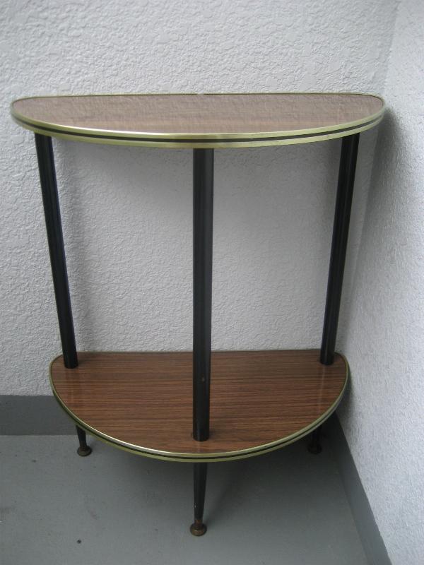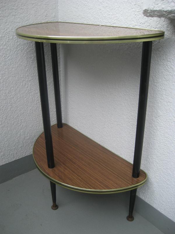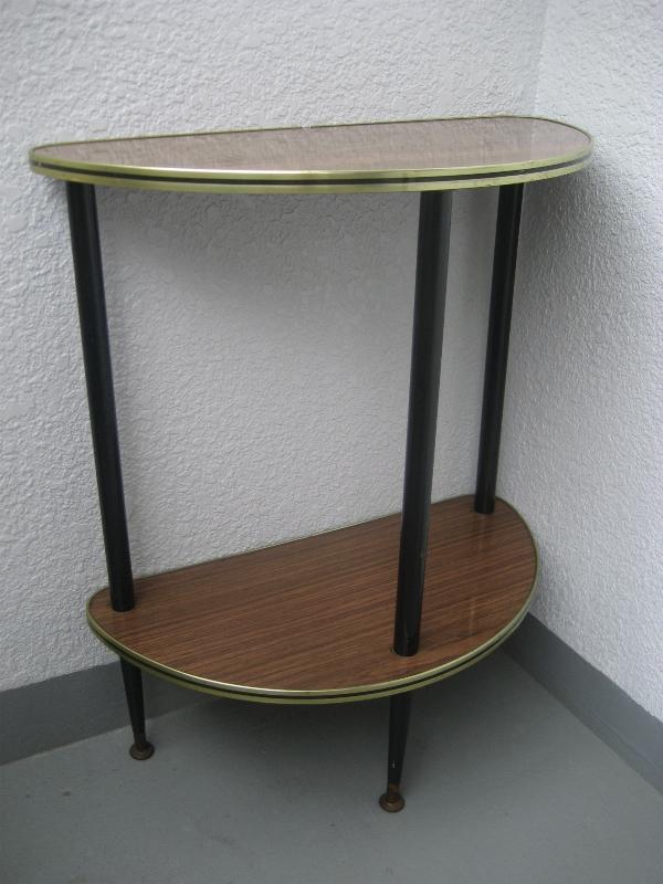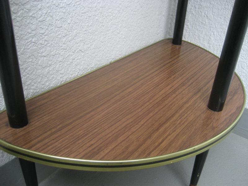 | ビンテージフロアシェルフ / 50-60年代 USA. ハーフラウンドシェイプの2段フロアシェルフ。シェルフの天板は化粧合板でエッジはゴールド にブラックのメタルモールフィニッシュ。レッグはウッドメイドの3本タイプ。お部屋のコーナー、ソファサイドやチェアサイドなど、リビングなどにクールでGOODなビンテージフロアピース! |