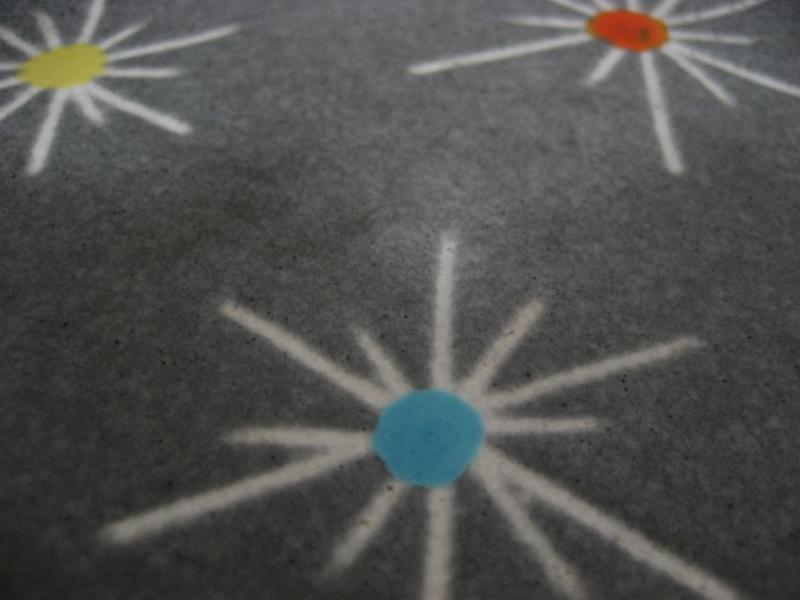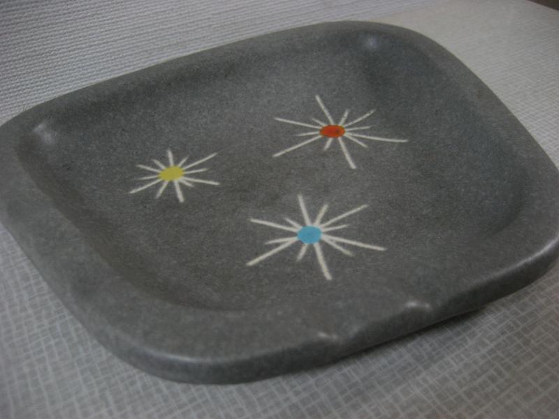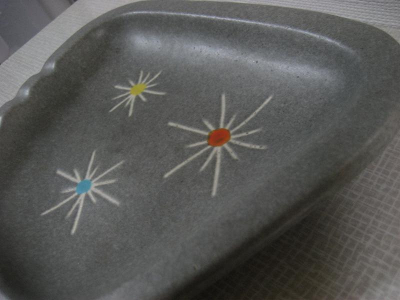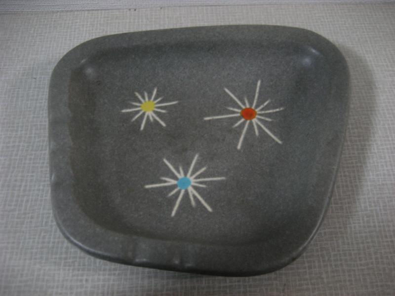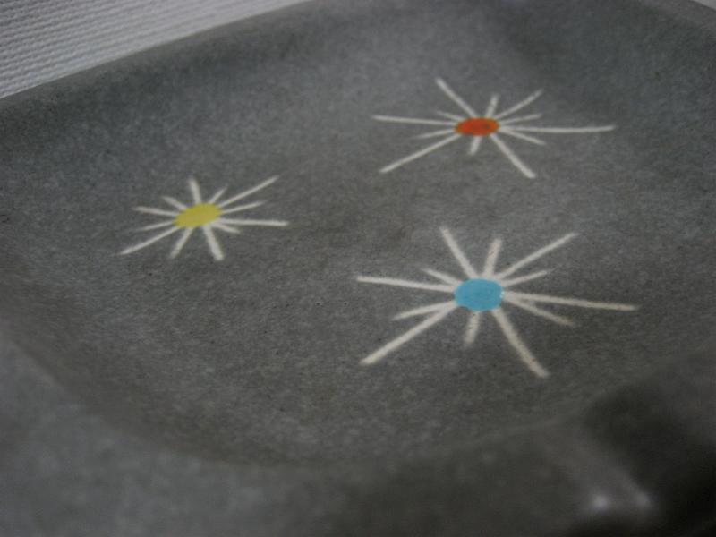 | ビンテージスターバーストアッシュトレイ / 50年代 "JARU" USA. カリフォルニア陶器の代表的なスタイルのスターバースト絵柄がクールなビンテージ灰皿。カラーはダークグレーベースに、スターバーストのセンターカラーにターコイズブルー・オレンジ・イエローの3色。クールでGOODなビンテージテーブルピース! |