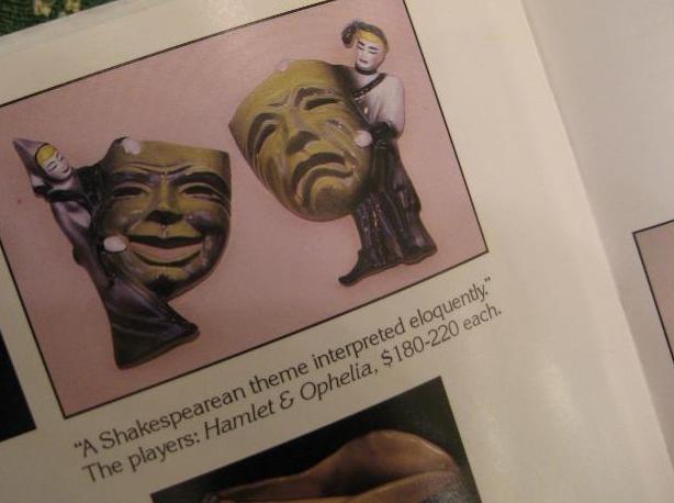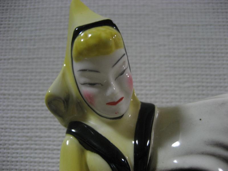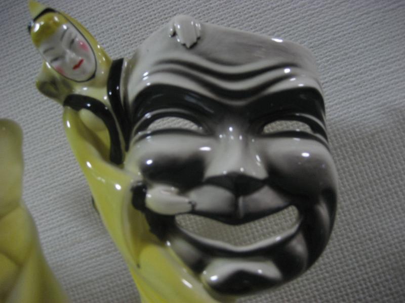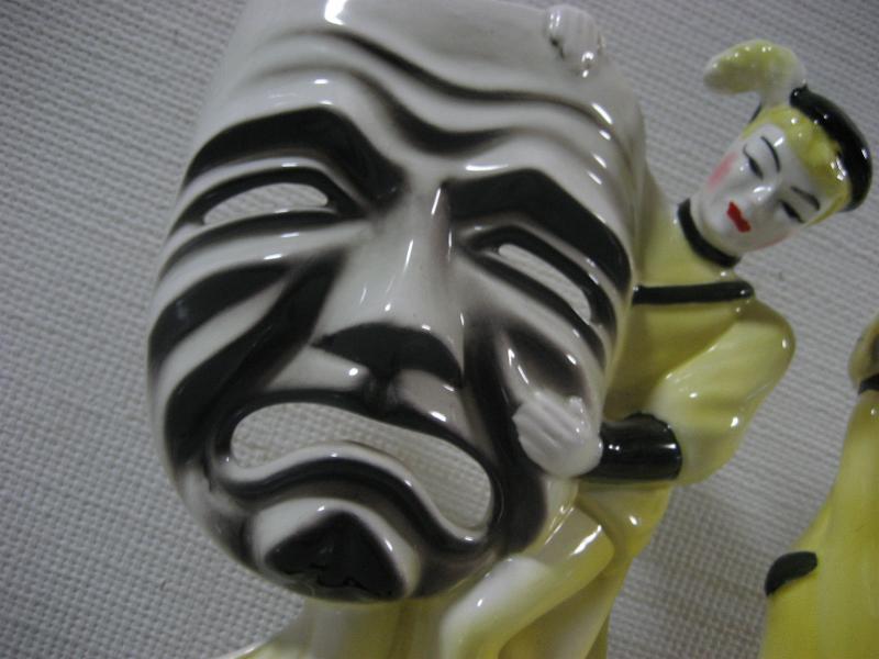 | ペアビンテージツーフェイスデコ / 50年代 1953 NAPCO, MAHANA INPORTING CAMPANY, NYC. USA それぞれ泣きと笑いを持った陶器製ペアです。壁掛けもできて、置物にも・・・ どちらもOK。 "セラミックアーツスタジオ社" のタイプ(上記写真参照)と同型でカラー違いのようです。陶器メーカーの "NAPCO社" が "MAHANA INPORTING CAMPANY" を通して、当時コストが安かった日本で製造し、輸入していた物と思われます。 |