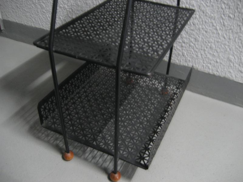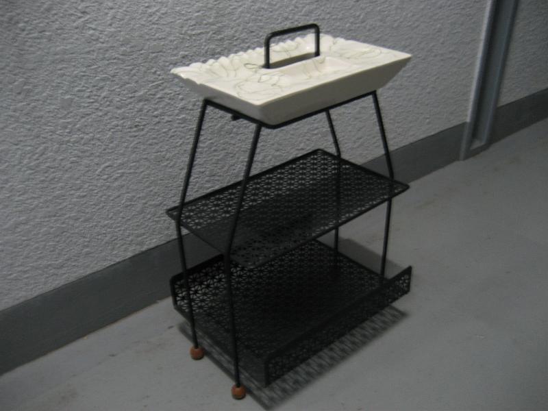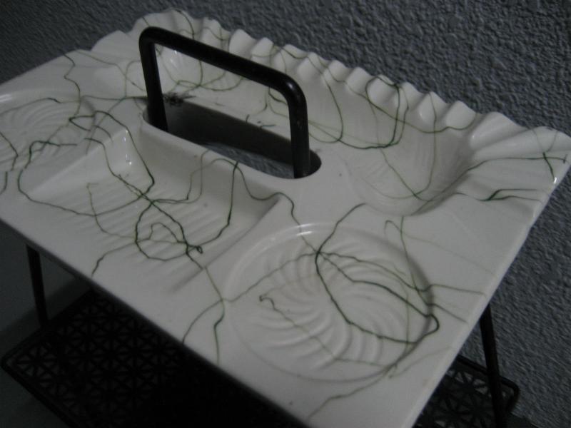 | ビンテージアッシュトレイアイアンシェルフラック / 50年代 USA. ブラックアイアンメイドの2段シェルフでトップに陶器製灰皿が乗ったビンテージアッシュトレイスタンド。灰皿はオフホワイトベースにグリーンドレーピングのカラーリング(写真ではわかりにくいですが・・・)で、グラスやカップなどを置く部分があります。アイアンフレームのレッグは4本でウッドボールアクセント。クールでGOODなビンテージフロアピース! |