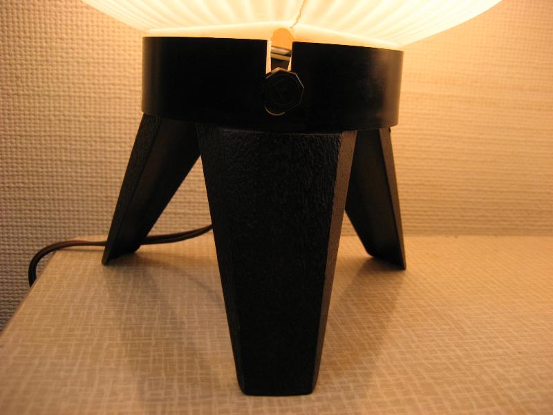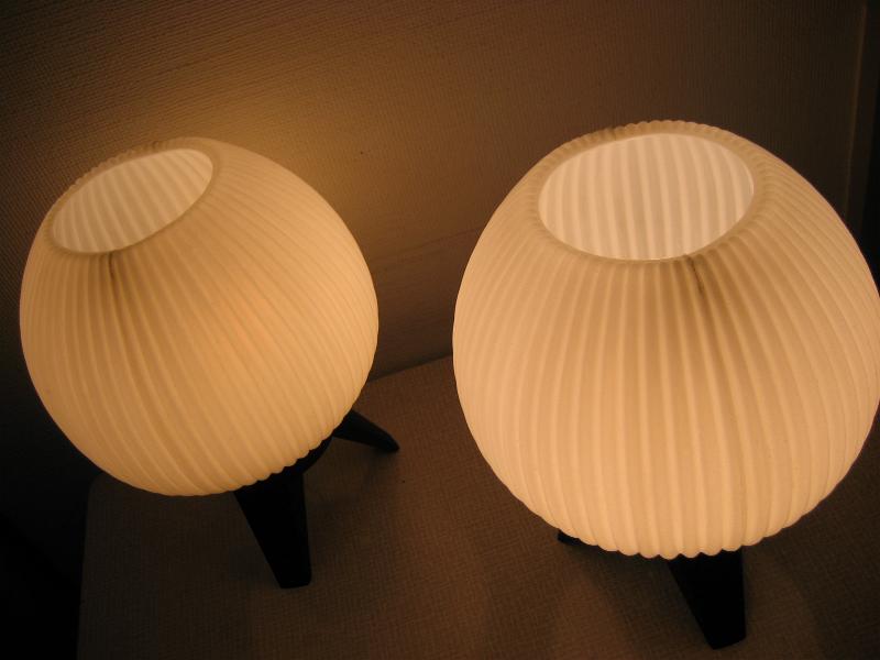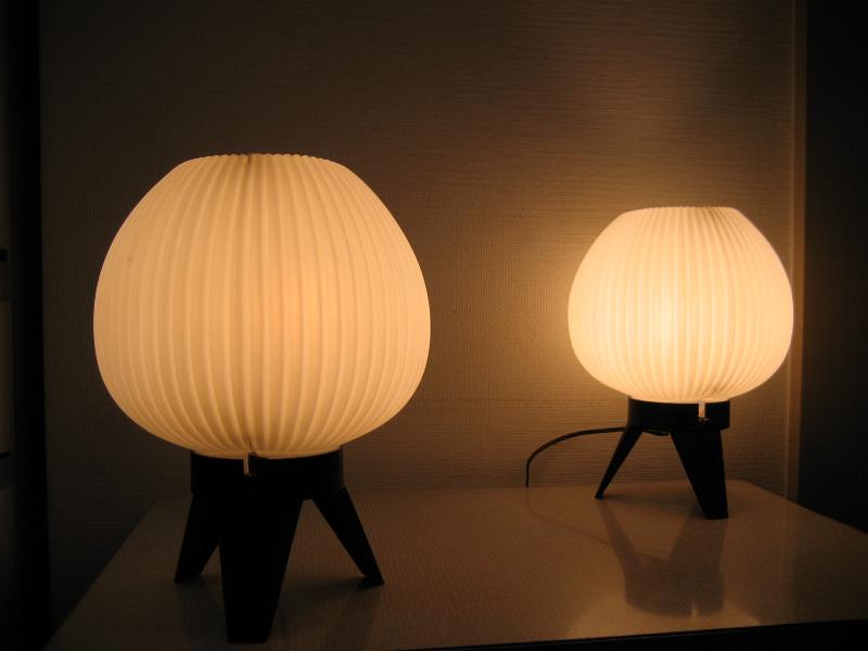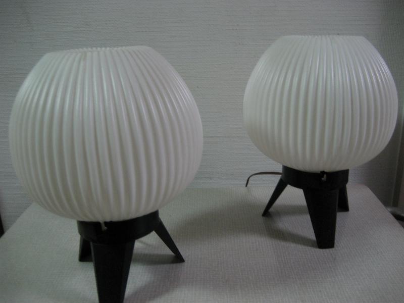 | ペアビンテージモダンテーブルランプ / 50-60年代 USA アトミックなドームシェイプシェードのテーブルランプセット。ブラックカラー3本レッグベースとシェードともにプラスチックメイド。クールでGOODなビンテージライティングピース! 電源は家庭用コンセント対応コードで、スイッチはベース側面に付いていてロータリータイプ。 |