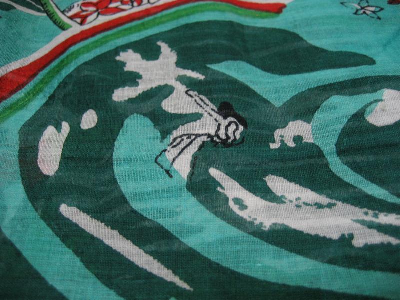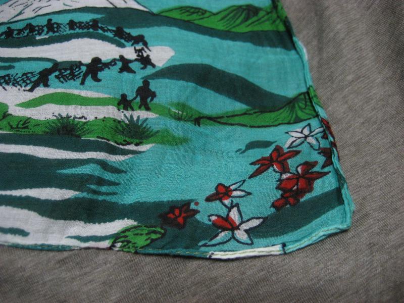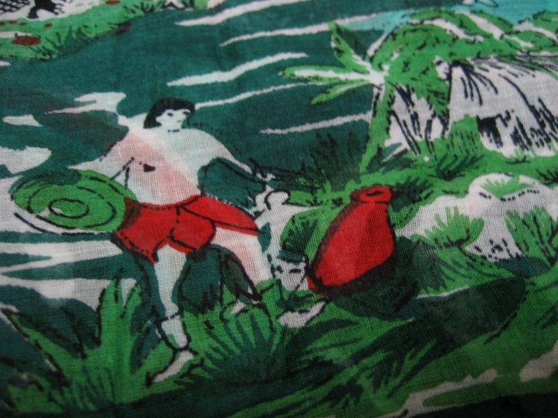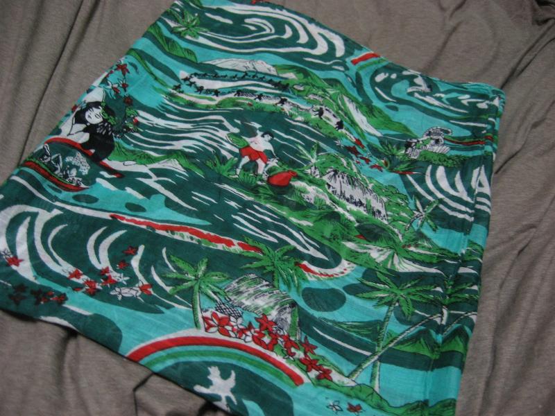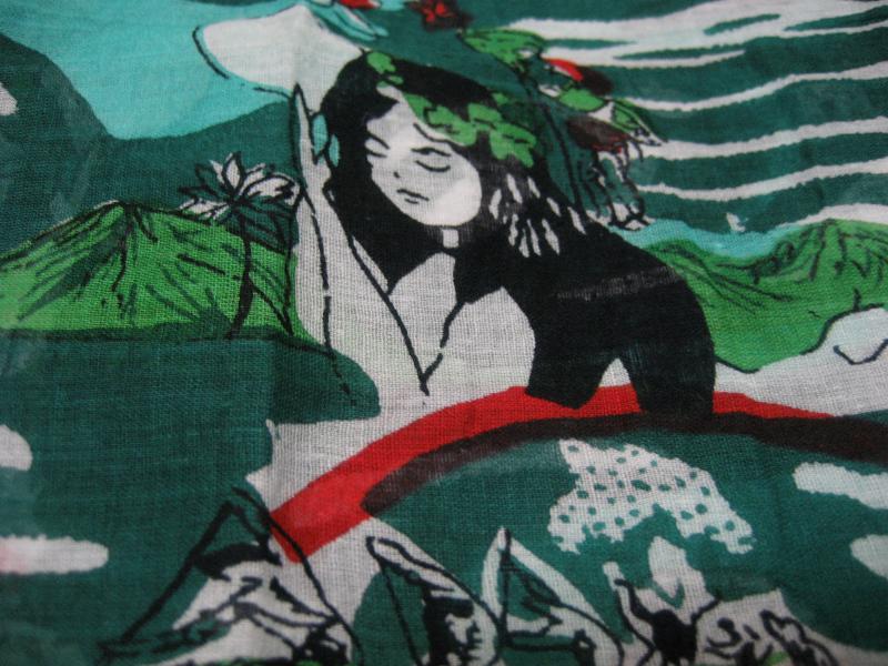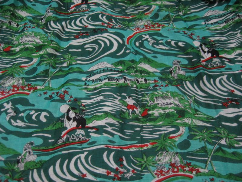 | ビンテージコットンファブリック / 70年代 USA. ハワイアン絵柄のガーゼ調コットンファブリックまたは大判スカーフ。グリーンベースにサーフィンや魚とり、現地女性の絵柄などなどの総柄プリント。大判ですので色々使えるクールでGOODなビンテージコレクティブルピース! |