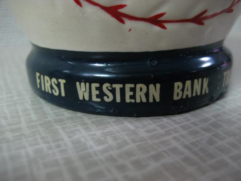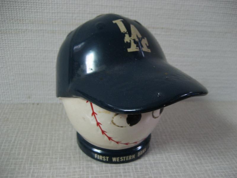 INC. USA / MADE IN JAPAN FIRST WESTERN BANK & TRUST CO. 野球のボールがベースボールキャップをかぶったアメリカらしいふざけたデザインの貯金箱。陶器製でチームはロサンゼルス・ドジャース。"ファーストウェスタンバンク&トラスト"のノベルティと思われます。クールでGOODなビンテージコレクティブルピース! |