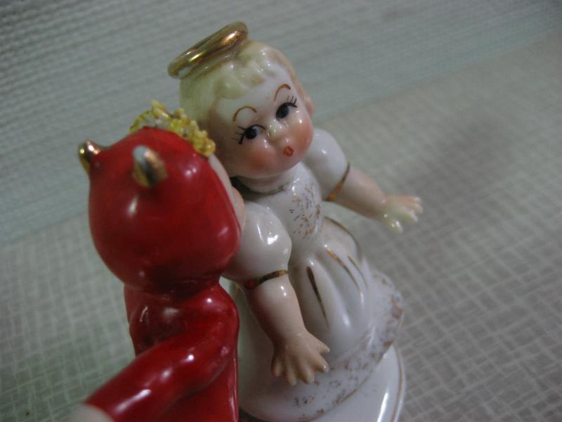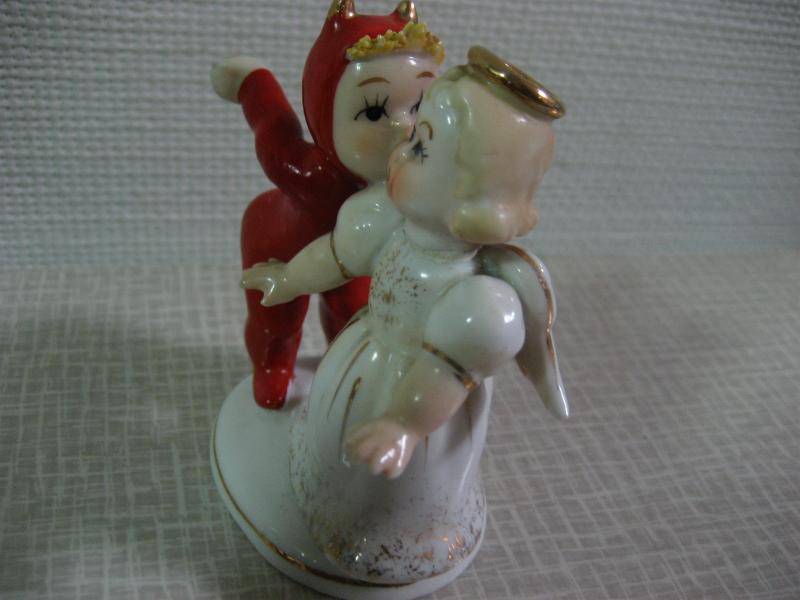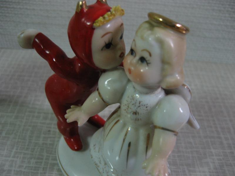 | ビンテージデビル&エンジェルデコ / 50年代 "K1055" Lefton, USA 陶器製のキッズデビルとエンジェルの置物。デビルキッズが女の子エンジェルにチューしようとしているシーン。なんともキュートでGOODなビンテージコレクティブルピース! |
