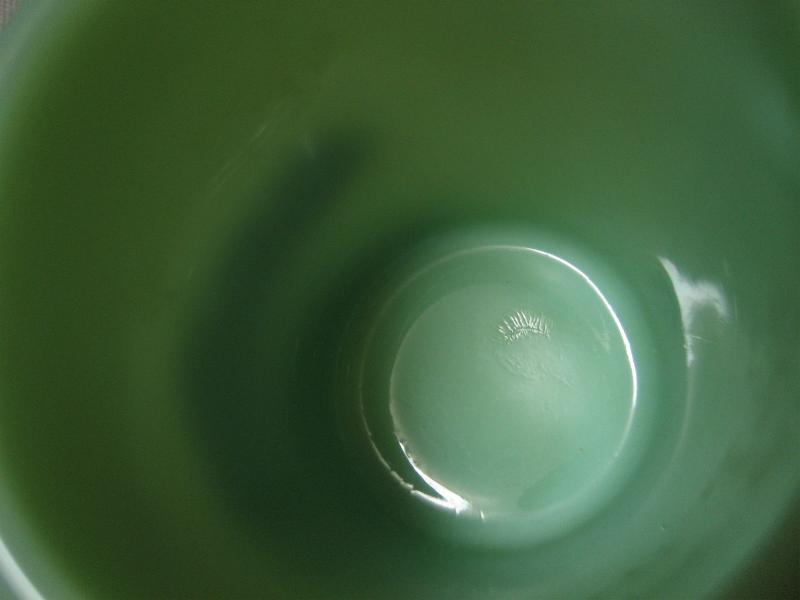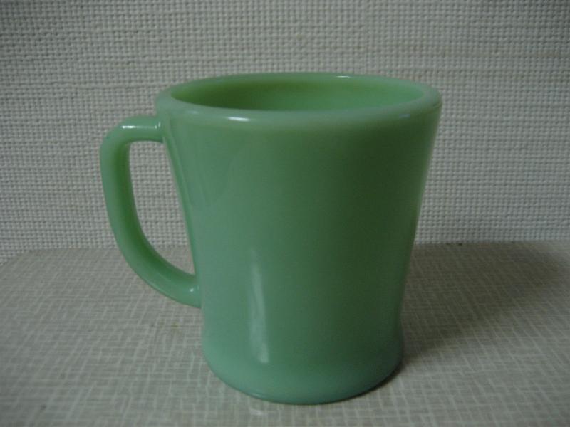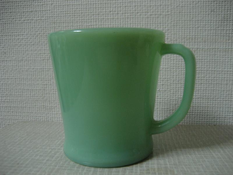 | ビンテージマグカップ / 40-50年代 Fire King / OVEN WARE ファイヤーキングの初期シェービングDハンドルマグ。 色は人気の高いジェードカラー。底面は平らなフラットボトムタイプです。 |