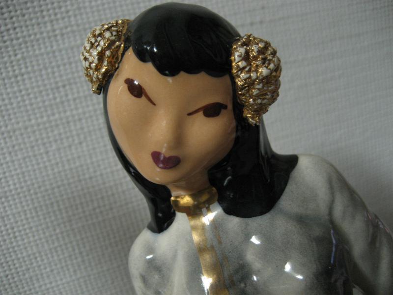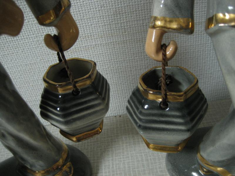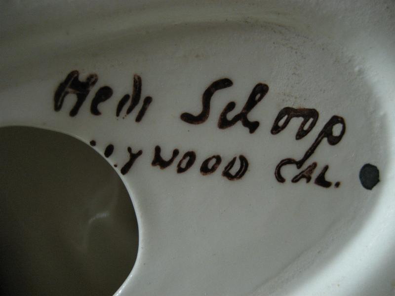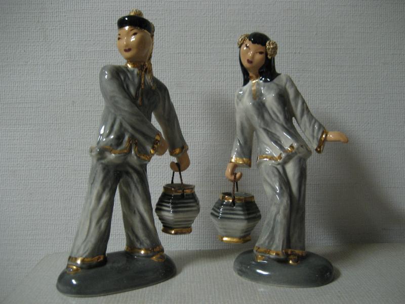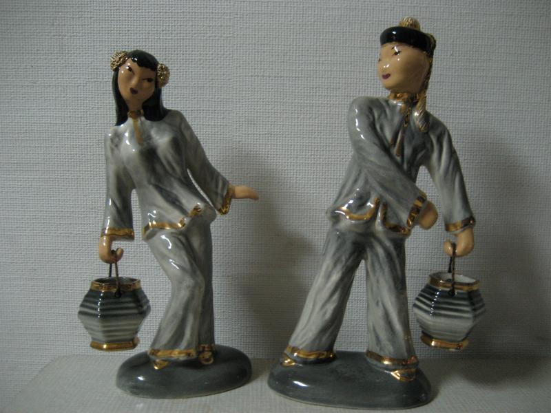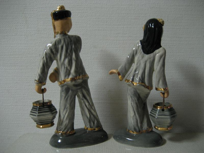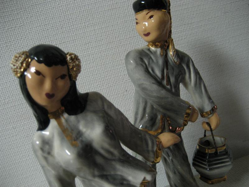 | ビンテージペアオリエンタルデコ / 40-50年代 Hedi Schoop, USA カリフォルニア陶器の代表的かつ、希少メーカーのヘディ・スクープ置物。40年代半ばから50年代半ばまでしか生産されなかったメーカーです。男女それぞれ手に紐状のハンドル付きのポット?のような物を持っています。 |