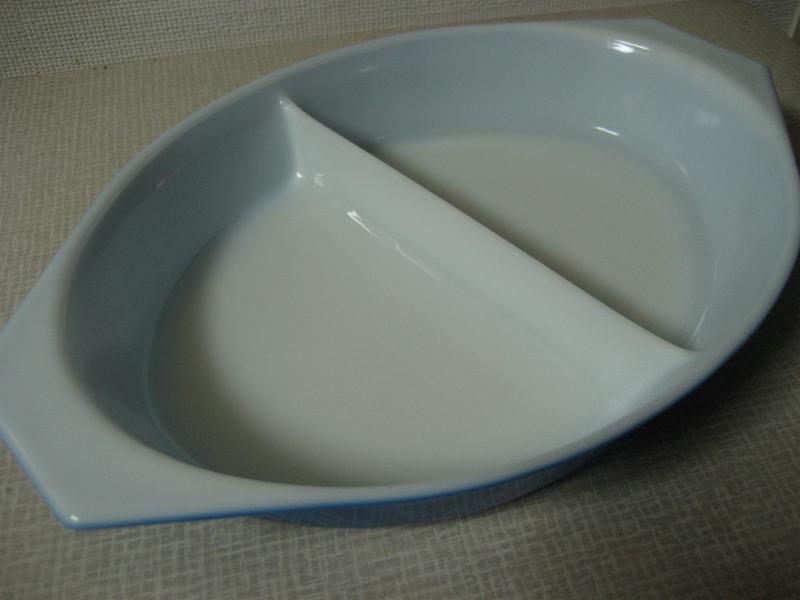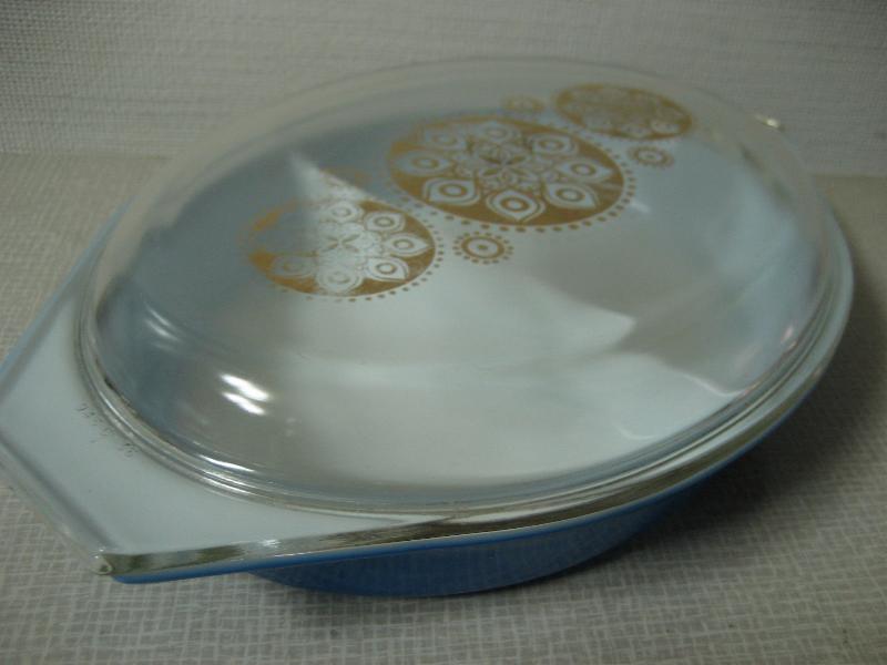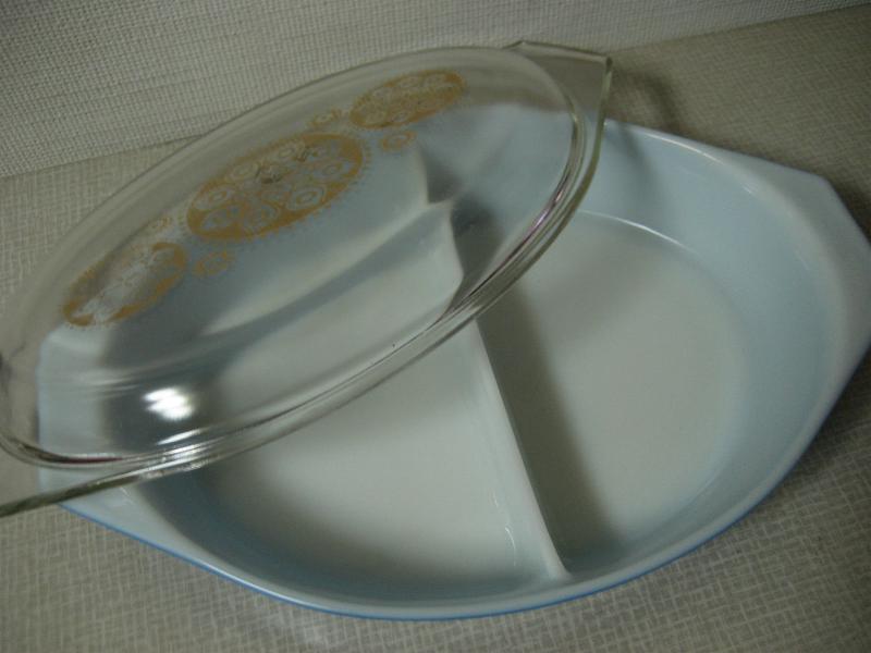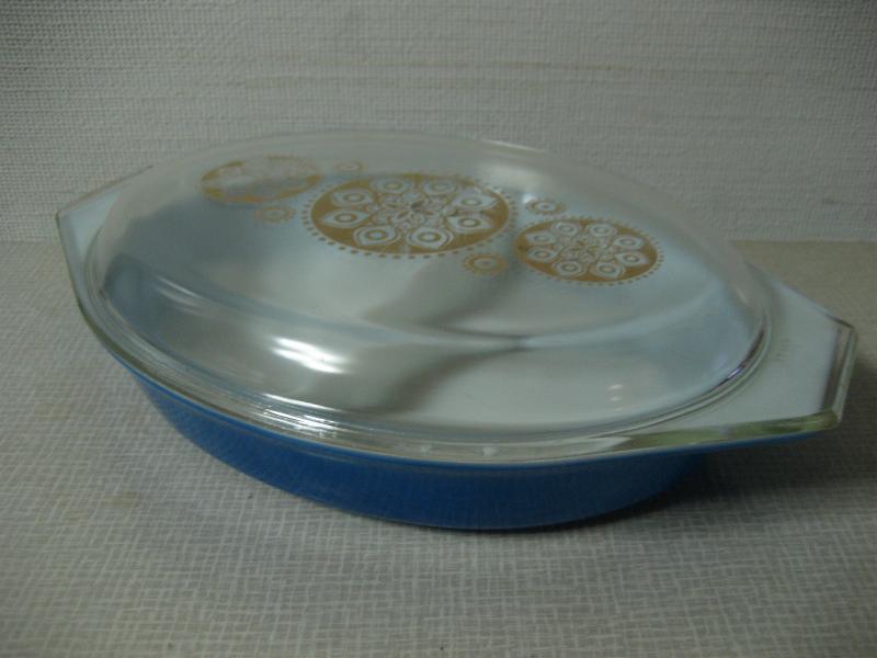 | ビンテージパイレックスカバーディッシュ / 60年代 Pyrex, MADE IN USA プリント入りクリアカバー付きの耐熱ガラスメイドのオールドパイレックスディッシュ。カラーはブルー。内側に仕切りがあるデザインフォルム。 |