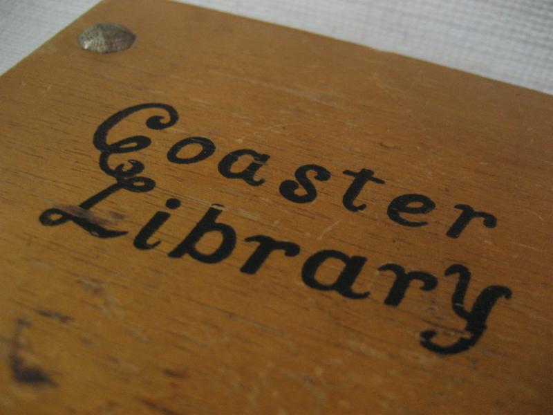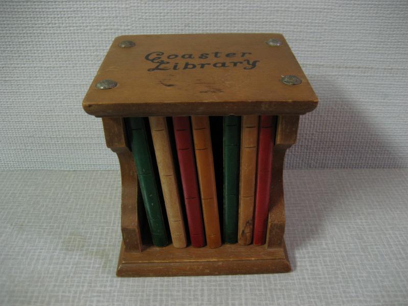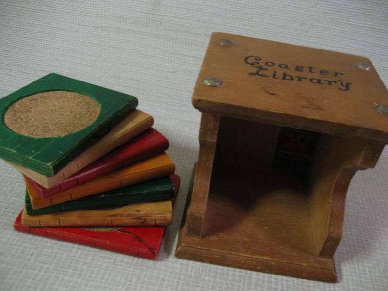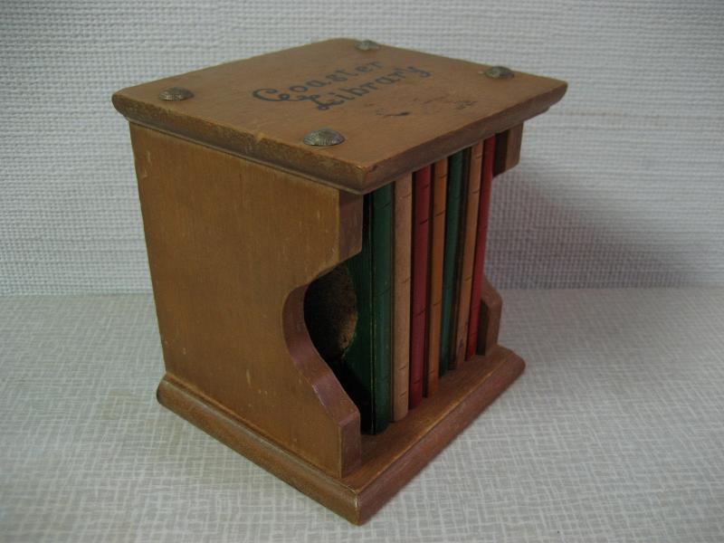 | ビンテージドリンクコースターセット / 60-70年代 USA ブックシェルフスタイルのコースターセット。ウッドメイドで色違いのコースターが本棚に納まっている感じ・・・ クールでGOODなビンテージテーブルウェア! |