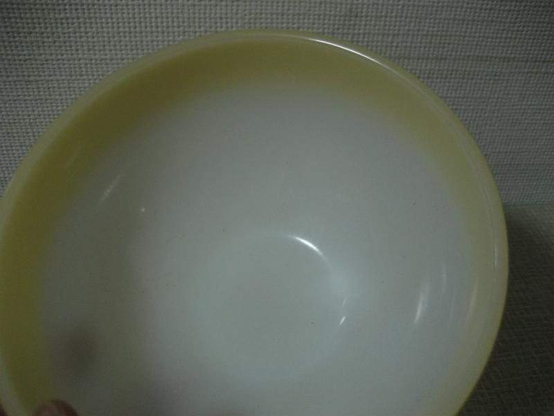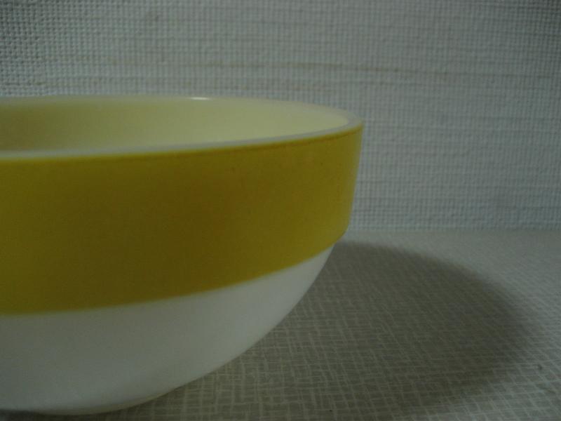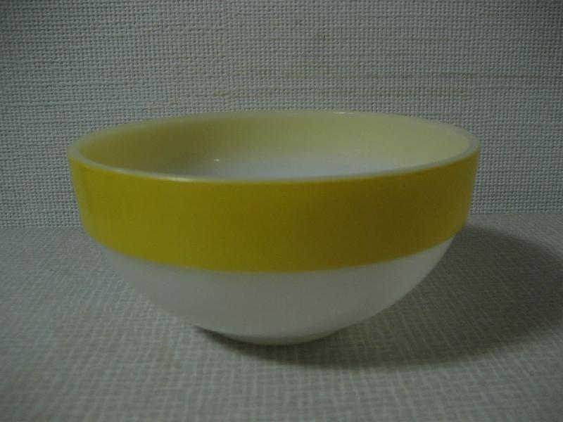 | ビンテージミキシングボウル / 50年代 Fire King / OVEN WARE/ MADE IN USA ファイヤーキングのバンドカラーミキシングボウル。オーブンウェアのミルクガラスにイエローカラーラインデザイン。 |