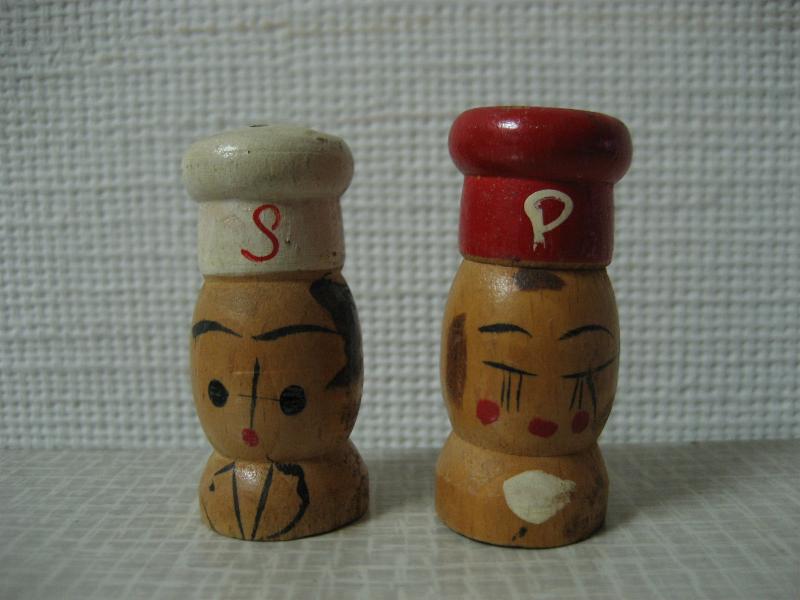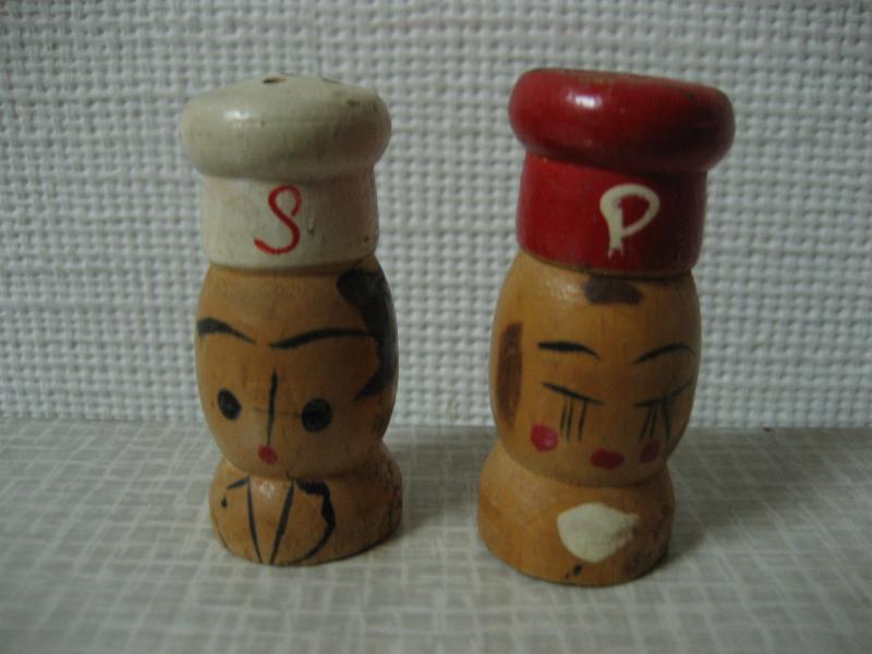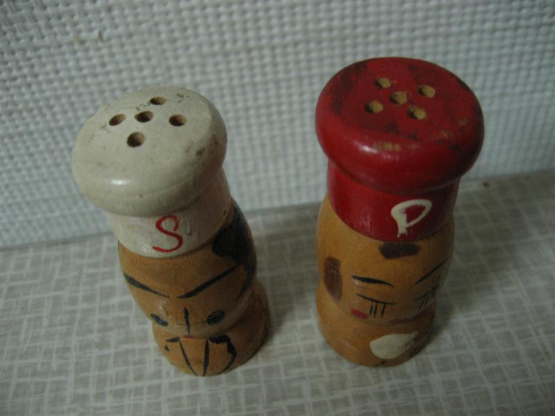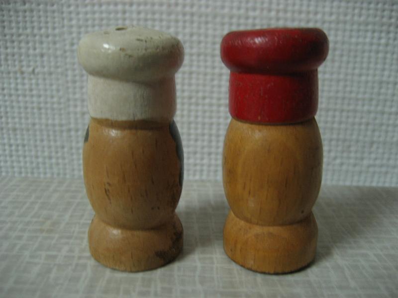 | ビンテージ ソルト&ペッパーシェーカーセット / 50-60年代 USA. ウッドメイドボディにハンドペイント調のビンテージS&P。コックスタイルのシェイプ&ペイントがとってもキュートでGOODなビンテージコレクティブルピース! |