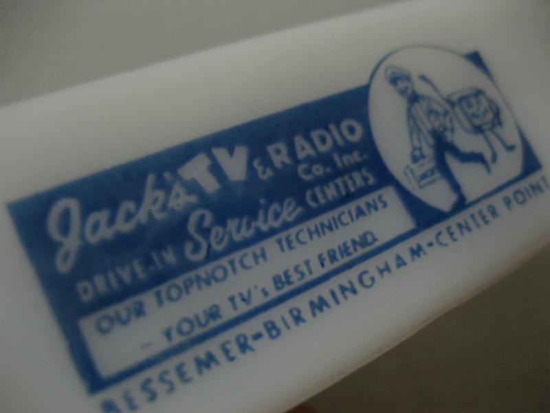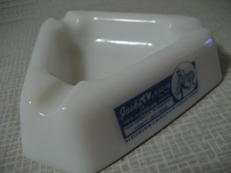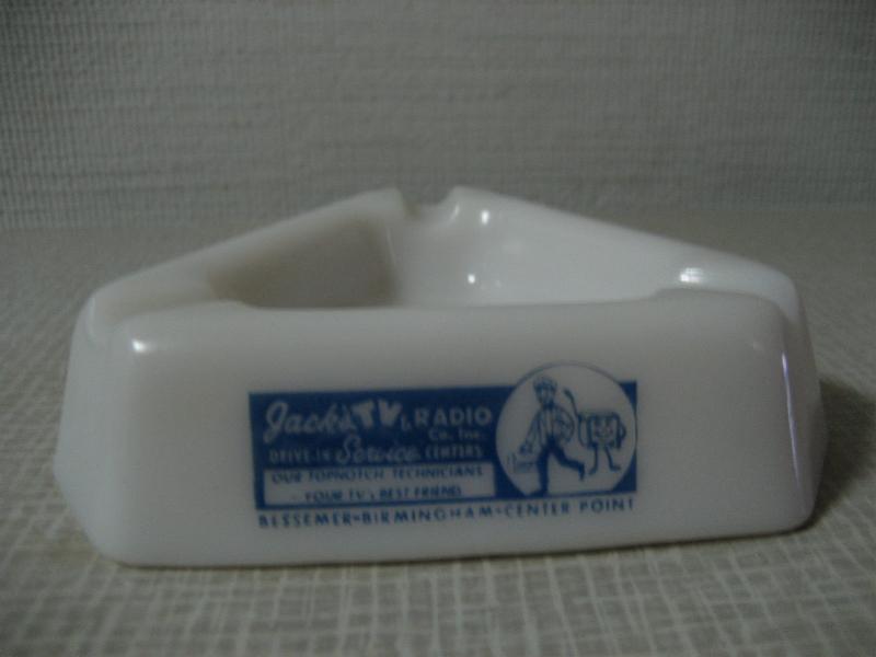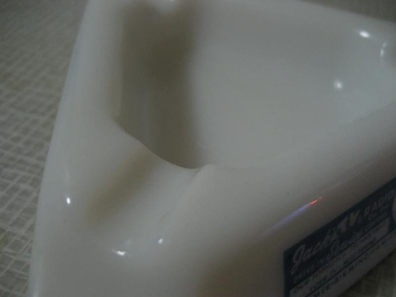 | ビンテージガラスアッシュトレイ / 50年代 USA. "Jack's TV & RADIO Co, Inc." 広告ノベルティ灰皿。つまり50年代頃のテレビ・ラジオ専門店? の宣伝用アイテムでしょうか。。。ファイヤーキングやパイレックスなどに代表されるミルクガラスメイドのアトミックなトライアングルシェイプで側面3面に店舗プリントがされています。使いやすくてGOODなビンテージテーブルピース。ディスプレイにもおススメ! |