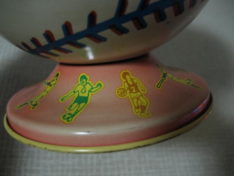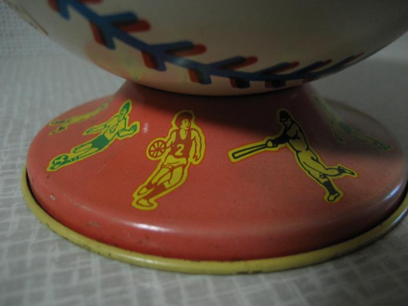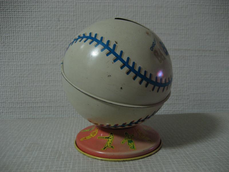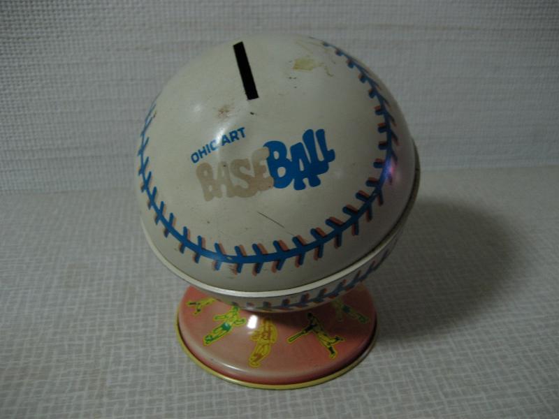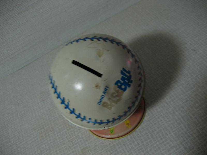 | ビンテージベースボールバンク / 50-60年代 OHIO ART USA "オハイオアート"の野球ボールシェイプ貯金箱。メタルメイドで底面に穴があります(裏蓋ロストしています)。ベース部分には色々なスポーツのプリントがされています。クールでGOODなビンテージコレクティブルピース! |