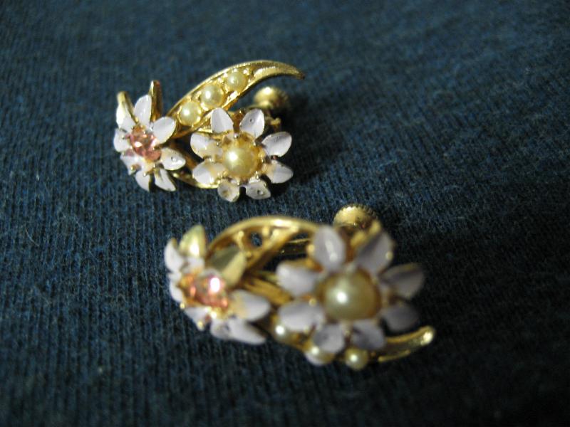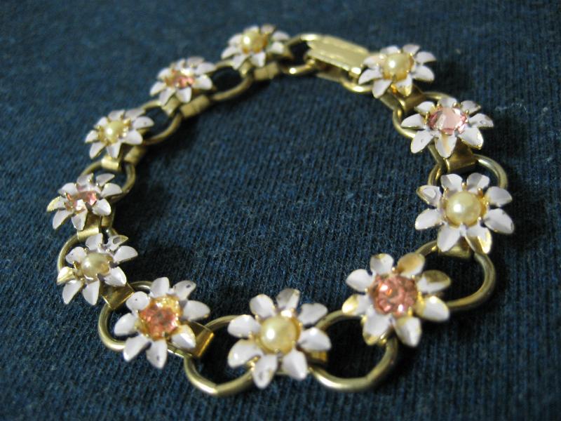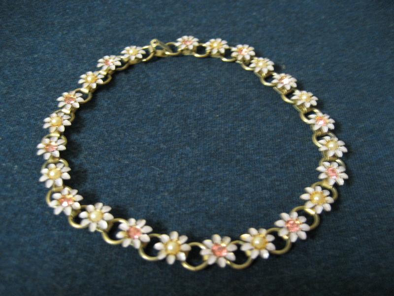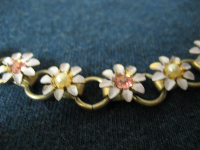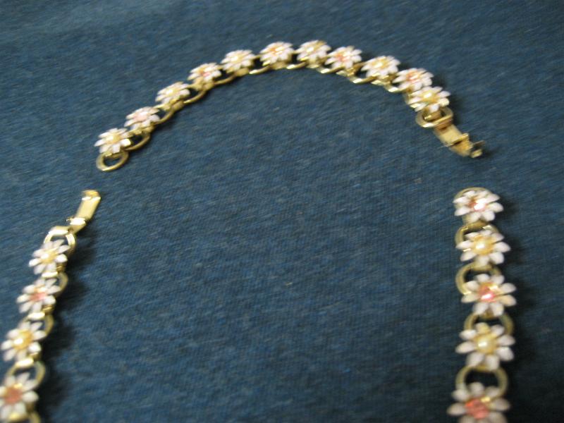 | ビンテージアクセサリーセット / 50年代 USA フラワーデザインのネックレス、ブレスレットとイヤリングの3点セット。メタルメイドでエナメルフィニッシュの花びらにセンターはパール調とピンク系のラインストーンアクセント。カラーはベースメタルがゴールド、花びらは淡いパープル。ブレスとネックレスを繋ぐことができるので長めのネックレスとしても楽しめます(上記画像参照)。キュートでGOODなビンテージアクセサリー! |