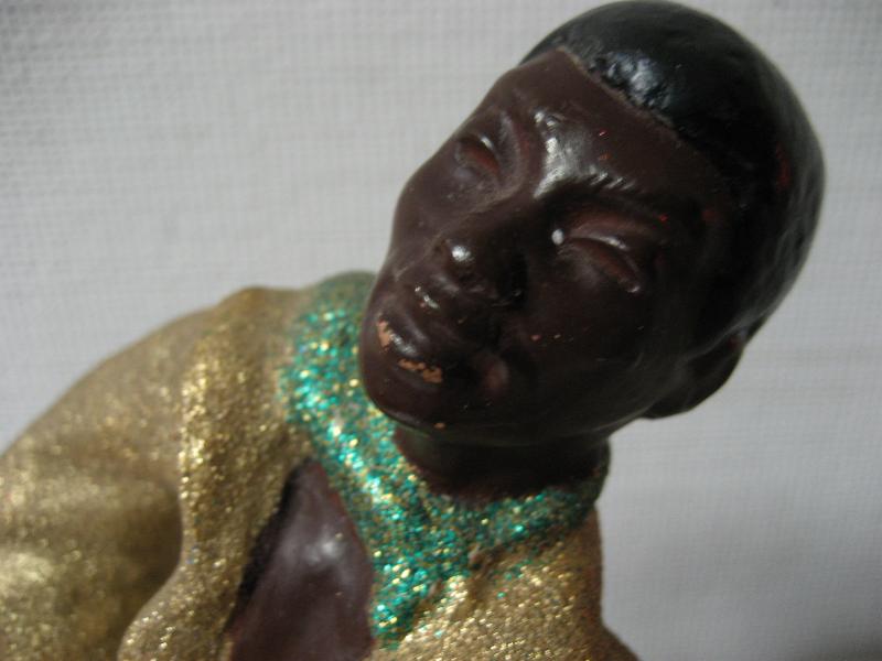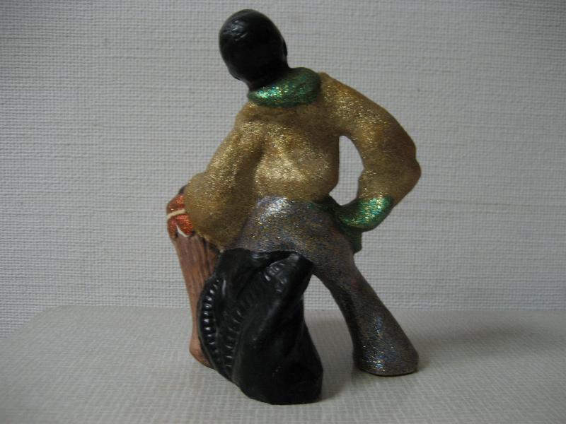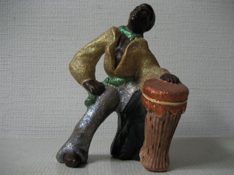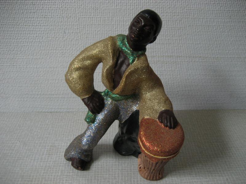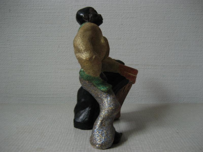 | ビンテージアフリカンデコ / 50-60年代 USA. 陶器製のアフリカンミュージシャン置物。ボンゴドラムの横に立っているポーズ。コスチュームにラメが入っていてクールです。ディスプレイにオススメのGOODなビンテージコレクティブルピース! |