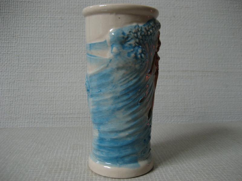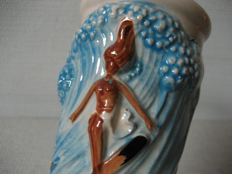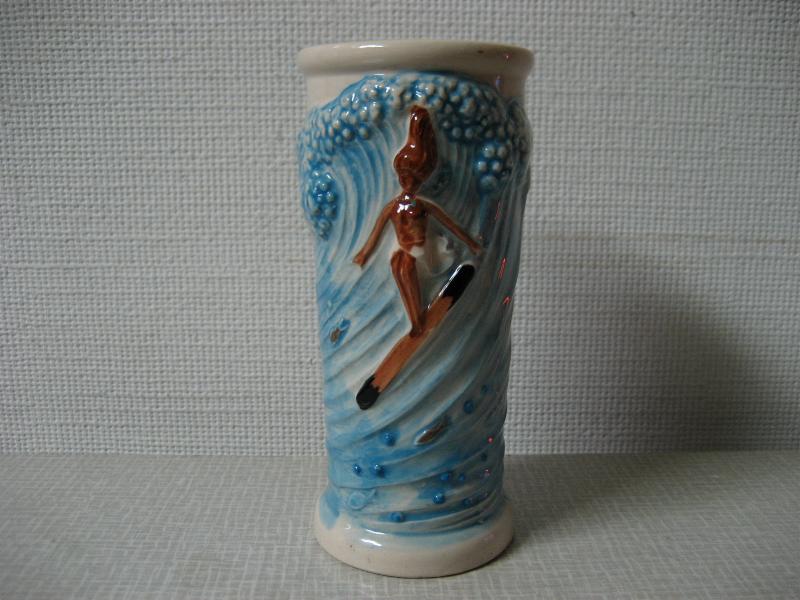 | ビンテージハワイアンタンブラー / 50年代 USA. サーフィン絵柄の陶器製タンブラー。内側から押し出して立体的に描かれた波乗りデザイン。クールでGOODなビンテージコレクティブルピース! |