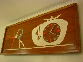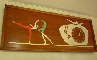 パネル 50年代 ツーフェイスとペアダンサーがデザインされた壁掛け時計です。ウッドフレームにウッドパネル、デコレーション部分は彫りこんでペイントされています。オレンジとミントブルーの配色。時計はバッテリー式ムーブメントですから特に狂いもありません。 |