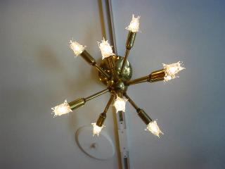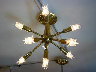 9個付き) スプートニクシーリングランプ / シャンデリア 9灯タイプのスプートニクです。中心の球体部分の真下に1本、その他8本のアームは球体側面に付いています。電源は家庭用引っ掛けシーリングに交換済ですのですぐに使用できます。 スター球は現行品です。 |