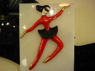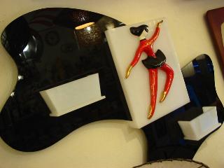 | モスランプ / ハーレクインウォールデコレーション / 壁掛け / 50年代 ブラックとホワイトのアクリルで加工されたアメーバ・ブーメランシェイプのウォールデコ。モスランプの本に載っているかなり稀少価値の高い物です!真ん中のハーレクインダンサーはへディ・スクープで陶器製。ダンサー部分のバックはライトアップします。それぞれ左右にプランターポケット付。 |
