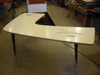 | ブーメランコーヒーテーブル / 50年代 アトミックなアクセントプリントのブーメランテーブルです。天板は化粧合板、3本足(ねじ込みタイプ)。50'sなリビングにぴったりのクールなテーブルです。 |