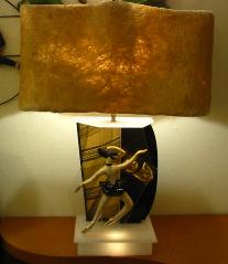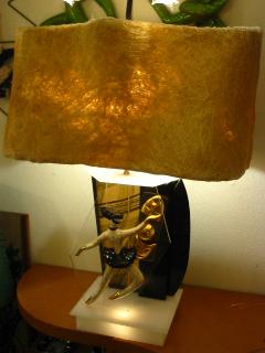 | ハーレクイン&ツーフェイスデコ付 モスランプ / 40-50年代 シェードランプ へディスクープの陶器製ハーレクインダンサーデコ付きモスランプ。バックパネルはファイバーグラスシェード材のパネルとブラックアクリルパネルで、ツーフェイスデコレーションはスイッチで回転します。モスランプならではの独特のヘアシェードに半透明アクリルベースで本体ランプとベースランプのダブルライトアップ。電源は家庭用コンセント対応コードで、スイッチは上下それぞれ別に付いています。ベースランプ用スイッチは3 way( ベースランプ・回転ツーフェイス・両方・OFF )になります。 |