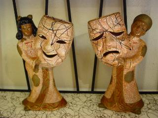 | オリエンタルツーフェイス置物 / 50年代 ツーフェイスを持った陶器製のオリエンタル置物ペアです。カラーも珍しいピンクベースにホワイトグレイズ、ブラックとゴールドアクセント。 |