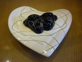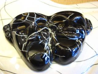 | ツーフェイス カバーボックス / 50年代 ツーフェイスデコ付きブーメランシェイプのシガレットカバーディッシュ(ボックス)。カバーはホワイトにブラックツーフェイス&ドレーピング、ディッシュはブラックにホワイトドレーピングタイプ。 大きめのサイズです。 |