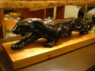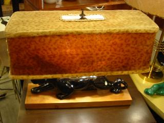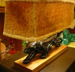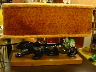 | パンサーシェードランプ / 50年代. 豹柄シェードのパンサーシェードランプ。ウッドベースに陶器製のブラックパンサー付きで、シェードはフェイクファーの豹柄スクエアタイプ。シェードの高さは調節可能でランプソケットはダブル( 現状は40W x 2個使用 )。 電源は家庭用コンセント対応コードで、スイッチはランプソケットにプル式が付いています。 |