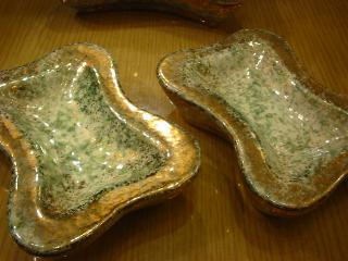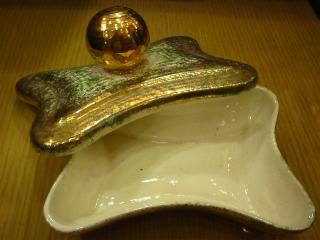 / 50年代 YONA, USA. 陶器製のシガレットボックスと灰皿2個セットです。カバー付きのボックスはボール状のハンドルが独特のデザインで灰皿と共にアメーバシェイプのフォルムがかなり良いです!"YONA" はセラミックアーツやヘディスクープと同時期の50年代を代表するデザイナーの1人。置物などもオリエンタルな感じの物が比較的多くアジアやミッドウエストの文化を特に意識していたと思われます。 |