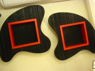 | ペアシャドウボックスウォールシェルフ / 50年代. アメーバブーメランシェイプのペアシェルフです。黒赤でクール!オリエンタルにもGOODです。小物などのディスプレイに! |
