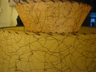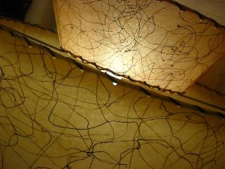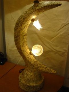 | アトミックシェードランプ / 50年代. スプートニク球とボール球のダブルスモールランプ付きシェードランプ。ファイバーグラスシェードは2段タイプで上段はやや赤みのあるベージュカラー。チョーク製ブーメランシェイプのランプベース。電源は家庭用コンセント対応コードで、スイッチはランプソケット側面に付いています。 |
