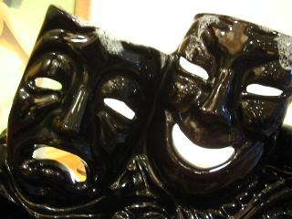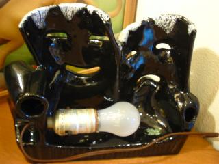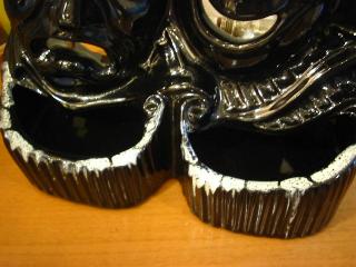 | ツーフェイスTVランプ / 50年代. ハリウッドセラミックス社 カリフォルニアメイドの陶器製プランターベース一体デザインのツーフェイスTVランプです。ブラックにホワイトアクセントカラー。泣き笑いの前面にプランターベース有り。電源は家庭用コンセント対応コードで、スイッチはランプソケット部分に付いています。 |