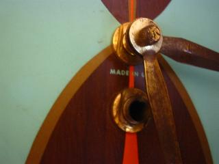 | スターバーストウォールクロック / 50年代 MADE IN USA. ターナーウォールアクセサリー社 ダイヤデザインのウッドベースにオレンジとミントブルーのスターバーストプリント。 ムーブメントはゼンマイ式フルオリジナル製。ゼンマイ用KEYも付いています。 時間の狂いに対して SLOW ⇔ FAST |