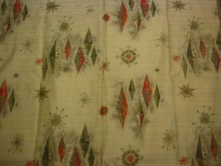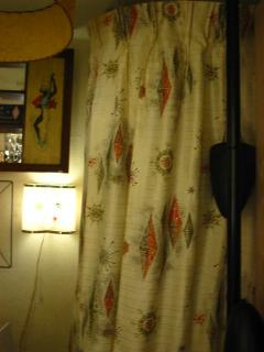 | アトミックハーレクインプリントカーテン / 50-60年代. ビンテージカーテンです。色はクリームのグラウンドベースカラーにカーキ・レッド・グレー・ゴールド・ブラックなどのダイヤ・スターバーストプリント。トップ部分はカーテンプリーツが取ってありますので市販のカーテンフックを取り付けるだけでOK!素材はコットン/レーヨンのような風合いです。 |