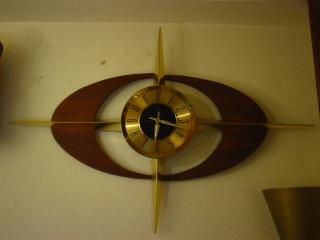 | スターバーストウォールクロック / 50年代 USA. ウッドのブーメランデコレーションの壁掛け時計です。バッテリー式(単2x1コ使用)ムーブメント。 |