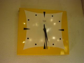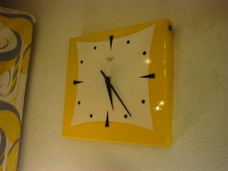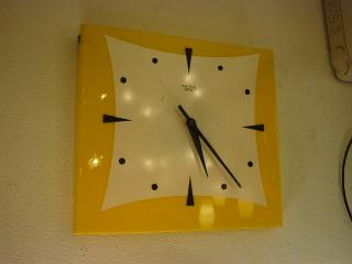 | アトミックウォールクロック / 50-60年代 SMITHS, MADE IN ENGLAND. アトミックモダンな壁掛け時計です。イエローアクリルベースにホワイトアトミックペイント。ムーブメントはバッテリー式(単3x1コ使用)に交換済みですので時間は正確です。 |