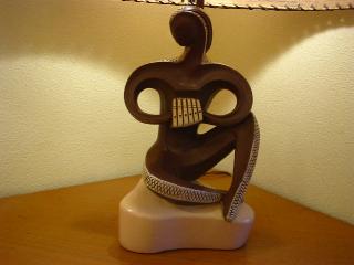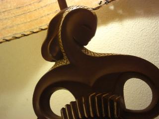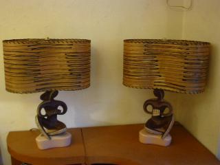 | ペアビンテージシェードランプ / 50年代. F.A.I.P, USA 男女ペアのミュージシャンタイプシェードランプです。ランプベースはチョーク製、カラーはピンクとブラウンでブーメランシェイプの分厚いベースが重量感有り!シェードはファイバーグラス製でベースに合わせたブーメランシェイプ。電源は家庭用コンセント対応コードで、スイッチはランプソケット側面にそれぞれ付いています。 |